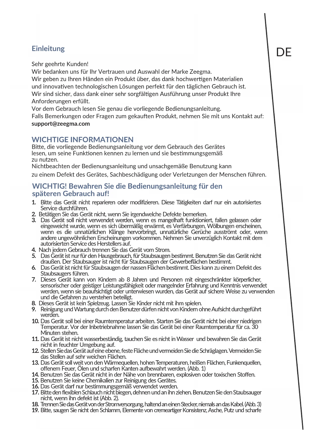 into the vacuum cleaner handle. The pictures are for reference only. The real design of the products may dier from the pictures presented. Roll-up button 1DE Einleitung Sehr geehrte Kunden! Wir bedanken uns für Ihr Vertrauen und Auswahl der Marke Zeegma. Wir geben zu Ihren Händen ein Produkt über, das dank hochwergen Materialien und innovaven technologischen Lösungen perfekt für den täglichen Gebrauch ist. Wir sind sicher, dass dank einer sehr sorgfälgen Ausführung unser Produkt Ihre Anforderungen erfüllt. Vor dem Gebrauch lesen Sie genau die vorliegende Bedienungsanleitung. Falls Bemerkungen oder Fragen zum gekauen Produkt, nehmen Sie mit uns Kontakt auf: support@zeegma.com WICHTIGE INFORMATIONEN Bie, die vorliegende Bedienungsanleitung vor dem Gebrauch des Gerätes lesen, um seine Funkonen kennen zu lernen und sie besmmungsgemäß zu nutzen. Nichtbeachten der Bedienungsanleitung und unsachgemäße Benutzung kann zu einem Defekt des Gerätes, Sachbeschädigung oder Verletzungen der Menschen führen. WICHTIG! Bewahren Sie die Bedienungsanleitung für den späteren Gebrauch auf!