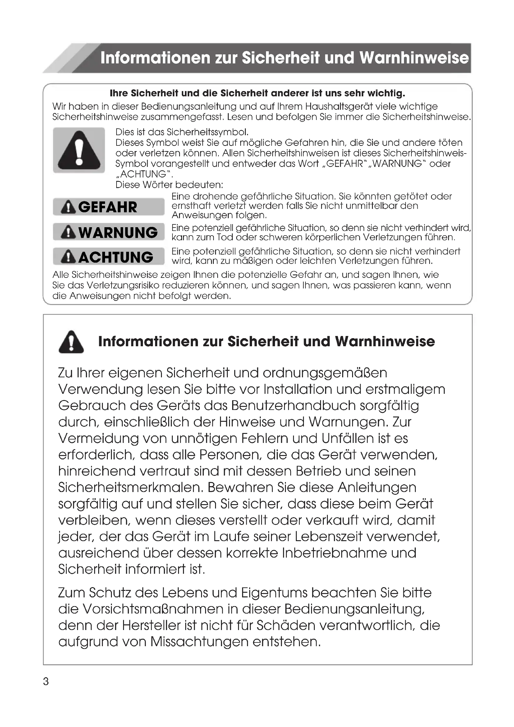 28Ihre Sicherheit und die Sicherheit anderer ist uns sehr wichtig. GEFAHR WARNUNG ACHTUNG Informationen zur Sicherheit und Warnhinweise Informationen zur Sicherheit und Warnhinweise Zu Ihrer eigenen Sicherheit und ordnungsgemäßen Verwendung lesen Sie bitte vor Installation und erstmaligem Gebrauch des Geräts das Benutzerhandbuch sorgfältig durch, einschließlich der Hinweise und Warnungen. Zur Vermeidung von unnötigen Fehlern und Unfällen ist es erforderlich, dass alle Personen, die das Gerät verwenden, hinreichend vertraut sind mit dessen Betrieb und seinen Sicherheitsmerkmalen. Bewahren Sie diese Anleitungen sorgfältig auf und stellen Sie sicher, dass diese beim Gerät verbleiben, wenn dieses verstellt oder verkauft wird, damit jeder, der das Gerät im Laufe seiner Lebenszeit verwendet, ausreichend über dessen korrekte Inbetriebnahme und Sicherheit informiert ist. Zum Schutz des Lebens und Eigentums beachten Sie bitte die Vorsichtsmaßnahmen in dieser Bedienungsanleitung, denn der Hersteller ist nicht für Schäden verantwortlich, die aufgrund von Missachtungen entstehen. Wir haben in dieser Bedienungsanleitung und auf Ihrem Haushaltsgerät viele wichtige Sicherheitshinweise zusammengefasst. Lesen und befolgen Sie immer die Sicherheitshinweise.Dies ist das Sicherheitssymbol.Dieses Symbol weist Sie auf mögliche Gefahren hin, die Sie und andere töten oder verletzen können. Allen Sicherheitshinweisen ist dieses Sicherheitshinweis-Symbol vorangestellt und entweder das Wort „GEFAHR“„WARNUNG“ oder „ACHTUNG“.Diese Wörter bedeuten:Eine drohende gefährliche Situation. Sie könnten getötet oder ernsthaft verletzt werden falls Sie nicht unmittelbar den Anweisungen folgen.Eine potenziell gefährliche Situation, so denn sie nicht verhindert wird, kann zum Tod oder schweren körperlichen Verletzungen führen.Eine potenziell gefährliche Situation, so denn sie nicht verhindert wird, kann zu mäßigen oder leichten Verletzungen führen. Alle Sicherheitshinweise zeigen Ihnen die potenzielle Gefahr an, und sagen Ihnen, wie Sie das Verletzungsrisiko reduzieren können, und sagen Ihnen, was passieren kann, wenn die Anweisungen nicht befolgt werden.Sicherheit für Kinder und Menschen mit Gebrechen Nach EN-Norm Dieses Gerät kann von Kindern von 8 Jahren und älter sowie Personen mit eingeschränkten körperlichen, sensorischen bzw. geistigen Fähigkeiten oder mangelnder Erfahrung und Wissen verwendet werden, wenn sie eine Beaufsichtigung bzw. Anweisung für die Nutzung der Maschine auf sichere Weise erfahren und die Risiken gekannt haben. Die Kinder dürfen nicht mit dem Gerät spielen. Die Reinigung und Wartung dürfen nicht von Kindern ohne Aufsicht durchgeführt werden. Die Kinder im Alter von 3 bis 8 Jahren dürfen Kühlgeräte be- und entladen. Nach IEC-Norm Dieses Gerät ist nicht dafür bestimmt, durch Personen (einschließlich Kinder) mit eingeschränkten physischen, sensorischen oder geistigen Fähigkeiten oder mangels Erfahrung und mangels Wissen benutzt zu werden, es sei denn, sie werden durch eine für ihre Sicherheit zuständige Person beaufsichtigt oder erhielten von ihr Anweisungen, wie das Gerät zu benutzen ist. Kinder sollten beaufsichtigt werden, um sicherzustellen, dass sie nicht mit dem Gerät spielen. Halten Sie alle Verpackungsteile von Kinder fern, weil es die Gefahr des Erstickens besteht. Ziehen Sie den Stecker aus der Buchse, wenn Sie das Gerät entsorgen, schneiden Sie das Verbindungskabel (so nah am Gerät wie möglich) ab und entfernen Sie die Tür, um zu vermeiden, dass spielende Kinder Stromschläge erhalten, wenn sie sich darin einschließen. Wenn Sie das Gerät, mit Magnettürverschluss, gegen eine älteres Gerät mit Schnappschloss (Verriegelung) an der Tür oder dem Deckel austauschen, achten Sie bitte darauf, das Schnappschloss unbrauchbar zu machen, bevor sie es entsorgen. Dadurch wird die Gefahr vermieden, dass für Kinder daraus eine Todesfalle wird. 4Allgemeine Sicherheitsvorschriften WARNUNG — Dieses Gerät ist für den Haushalt und ähnliche Anwendungen wie -Mitarbeiter-Küchenbereiche in Läden, Büros und anderen Arbeitsumgebungen; -Bauernhäuser und von Kunden in Hotels, Motels und anderen Wohnräumen; -Bett- und Frühstück-Typ Umgebungen; -Gastronomie und ähnliche Non-Retail-Anwendungen. WARNUNG — Bewahren Sie keine explosiven Stoffe wie Spraydosen mit brennbaren Treibmittel in diesem Gerät. WARNUNG — Wenn das Netzkabel beschädigt ist, muss es durch den Hersteller, seinen Kundendienst oder eine ähnlich qualifizierte Person ersetzt werden, um eine Gefahr zu vermeiden. WARNUNG — Halten Sie die Belüftungsöffnungen, die Geräteverkleidung oder die integrierte Struktur von Behinderungen frei. WARNUNG — Verwenden Sie keine mechanischen Vorrichtungen oder anderen Mittel, um den Entfrostungsprozess zu beschleunigen, außer wenn die vom Hersteller empfohlen sind. WARNUNG — Beschädigen Sie den Kältemittelkreislauf nicht. WARNUNG — Verwenden Sie keine elektrischen Geräte innerhalb des Lebensmittellablagefachs des Gerätes, außer wenn sie die vom Hersteller empfohlenen Typen sind. WARNUNG — Das Kältemittel und Isoliertreibgas sind brennbar. Bei der Entsorgung des Geräts handeln Sie es nur bei einem zugelassenen Entsorgungszentrum. Nicht Flamme aussetzen. WARNUNG — Stellen Sie bei der Positionierung des Geräts sicher, dass das Netzkabel nicht eingeklemmt oder beschädigt ist. 5WARNUNG — Stellen Sie die Mehrfachkupplungssteckdose oder portable Stromversorgung nicht an der Geräterückseite auf. WARNUNG — Die Lebensmittel müssen in Säcken verpackt werden, bevor sie in den Kühlschrank gestellt werden. Und die Flüssigkeiten müssen in Flaschen oder in verschlossenen Behältern verpackt werden, um das Problem zu vermeiden, dass die Produktdesignstruktur nicht leicht zu reinigen ist. Das Symbol ist eine Warnung und zeigt an, dass das Kältemittel und das Treibgas der Isolierung brennbar sind. Warnung: Gefahr von 