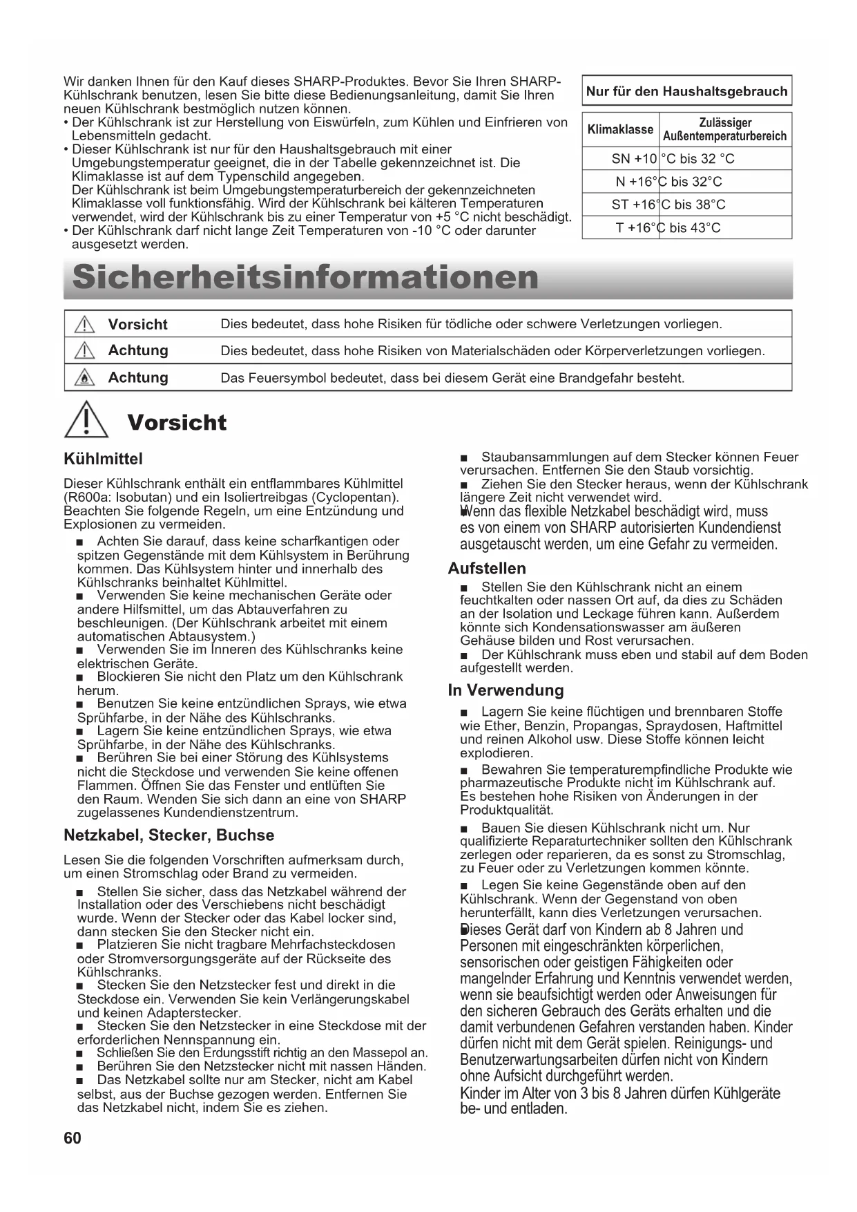・60 Wir danken Ihnen für den Kauf dieses SHARP-Produktes. Bevor Sie Ihren SHARP- Kühlschrank benutzen, lesen Sie bitte diese Bedienungsanleitung, damit Sie Ihren neuen Kühlschrank bestmöglich nutzen können.