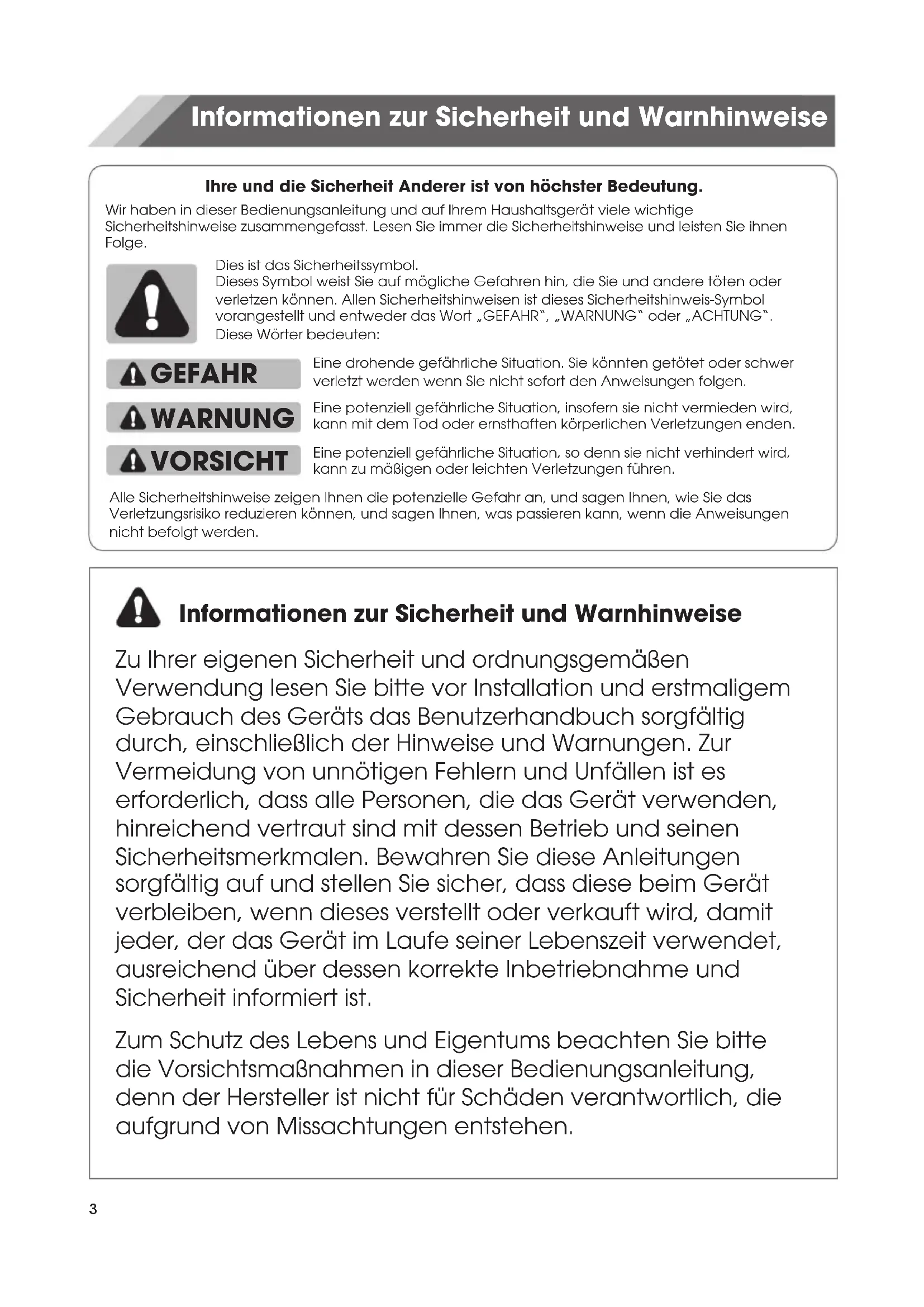 19Ihre und die Sicherheit Anderer ist von höchster Bedeutung. GEFAHR Informationen zur Sicherheit und Warnhinweise Informationen zur Sicherheit und Warnhinweise Zu Ihrer eigenen Sicherheit und ordnungsgemäßen Verwendung lesen Sie bitte vor Installation und erstmaligem Gebrauch des Geräts das Benutzerhandbuch sorgfältig durch, einschließlich der Hinweise und Warnungen. Zur Vermeidung von unnötigen Fehlern und Unfällen ist es erforderlich, dass alle Personen, die das Gerät verwenden, hinreichend vertraut sind mit dessen Betrieb und seinen Sicherheitsmerkmalen. Bewahren Sie diese Anleitungen sorgfältig auf und stellen Sie sicher, dass diese beim Gerät verbleiben, wenn dieses verstellt oder verkauft wird, damit jeder, der das Gerät im Laufe seiner Lebenszeit verwendet, ausreichend über dessen korrekte Inbetriebnahme und Sicherheit informiert ist. Zum Schutz des Lebens und Eigentums beachten Sie bitte die Vorsichtsmaßnahmen in dieser Bedienungsanleitung, denn der Hersteller ist nicht für Schäden verantwortlich, die aufgrund von Missachtungen entstehen. Wir haben in dieser Bedienungsanleitung und auf Ihrem Haushaltsgerät viele wichtige Sicherheitshinweise zusammengefasst. Lesen Sie immer die Sicherheitshinweise und leisten Sie ihnen Folge. Dies ist das Sicherheitssymbol. Dieses Symbol weist Sie auf mögliche Gefahren hin, die Sie und andere töten oder verletzen können. Allen Sicherheitshinweisen ist dieses Sicherheitshinweis-Symbol vorangestellt und entweder das Wort „GEFAHR“, „WARNUNG“ oder „ACHTUNG“. Diese Wörter bedeuten: Eine drohende gefährliche Situation. Sie könnten getötet oder schwer verletzt werden wenn Sie nicht sofort den Anweisungen folgen. Eine potenziell gefährliche Situation, insofern sie nicht vermieden wird, kann mit dem Tod oder ernsthaften körperlichen Verletzungen enden. Eine potenziell gefährliche Situation, so denn sie nicht verhindert wird, kann zu mäßigen oder leichten Verletzungen führen.