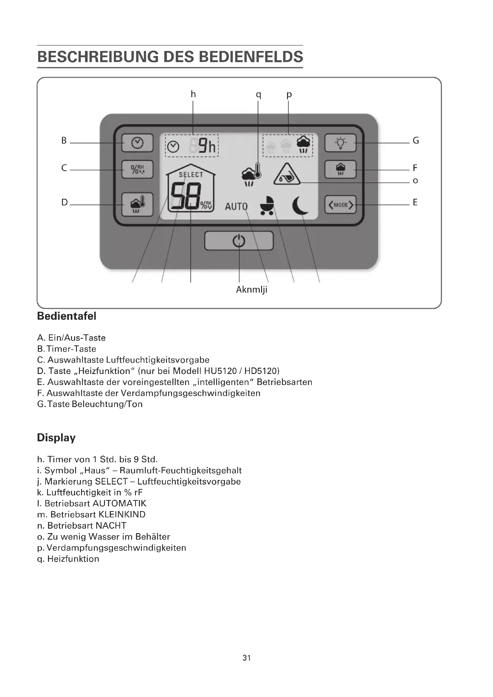 j. Markierung SELECT – Luftfeuchtigkeitsvorgabe k. Luftfeuchtigkeit in % rF l. Betriebsart AUTOMATIK m. Betriebsart KLEINKIND n. Betriebsart NACHT o. Zu wenig Wasser im Behälter p. Verdampfungsgeschwindigkeiten q. Heizfunktion