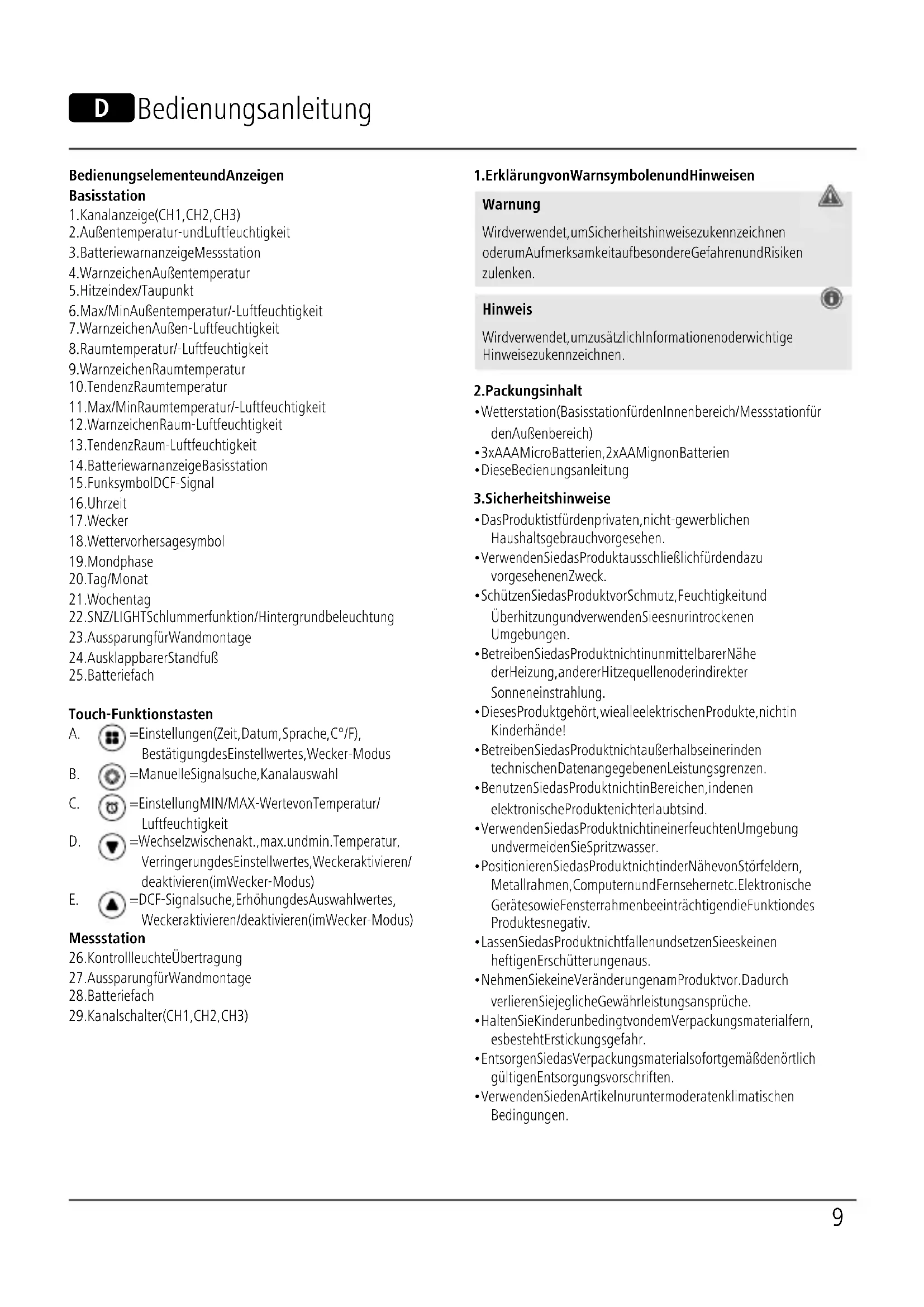 - Die Reichweite der Funkübertragung zwischen der Mess- und Basisstation beträgt im freien Gelände bis zu 30 m.