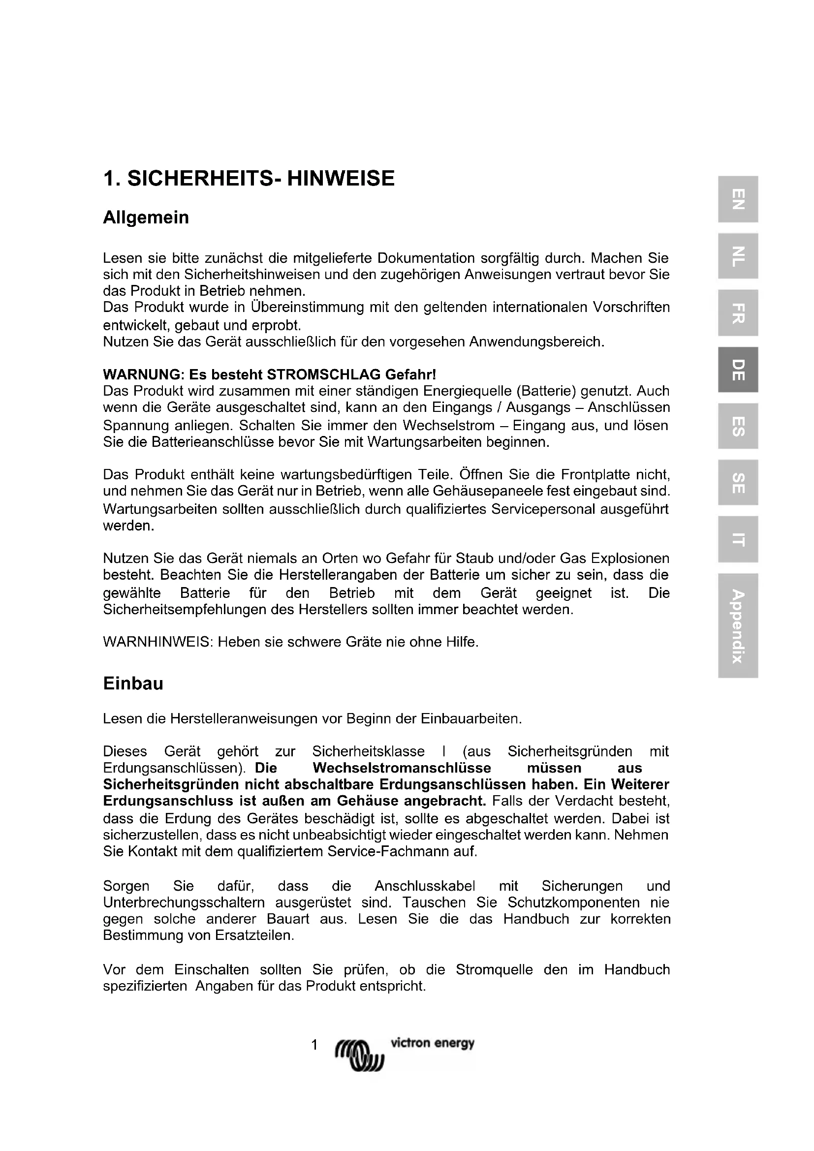 Allgemein Lesen sie bitte zunächst die mitgelieferte Dokumentation sorgfältig durch. Machen Sie sich mit den Sicherheitshinweisen und den zugehörigen Anweisungen vertraut bevor Sie das Produkt in Betrieb nehmen. Das Produkt wurde in Übereinstimmung mit den geltenden internationalen Vorschriften entwickelt, gebaut und erprobt. Nutzen Sie das Gerät ausschließlich für den vorgesehen Anwendungsbereich. WARNUNG: Es besteht STROMSCHLAG Gefahr! Das Produkt wird zusammen mit einer ständigen Energiequelle (Batterie) genutzt. Auch wenn die Geräte ausgeschaltet sind, kann an den Eingangs / Ausgangs – Anschlüssen Spannung anliegen. Schalten Sie immer den Wechselstrom – Eingang aus, und lösen Sie die Batterieanschlüsse bevor Sie mit Wartungsarbeiten beginnen. Das Produkt enthält keine wartungsbedürftigen Teile. Öffnen Sie die Frontplatte nicht, und nehmen Sie das Gerät nur in Betrieb, wenn alle Gehäusepaneele fest eingebaut sind. Wartungsarbeiten sollten ausschließlich durch qualifiziertes Servicepersonal ausgeführt werden. Nutzen Sie das Gerät niemals an Orten wo Gefahr für Staub und/oder Gas Explosionen besteht. Beachten Sie die Herstellerangaben der Batterie um sicher zu sein, dass die gewählte Batterie für den Betrieb mit dem Gerät geeignet ist. Die Sicherheitsempfehlungen des Herstellers sollten immer beachtet werden. WARNHINWEIS: Heben sie schwere Gräte nie ohne Hilfe. Einbau Lesen die Herstelleranweisungen vor Beginn der Einbauarbeiten. Dieses Gerät gehört zur Sicherheitsklasse I (aus Sicherheitsgründen mit Erdungsanschlüssen). Die Wechselstromanschlüsse müssen aus Sicherheitsgründen nicht abschaltbare Erdungsanschlüssen haben. Ein Weiterer Erdungsanschluss ist außen am Gehäuse angebracht. Falls der Verdacht besteht, dass die Erdung des Gerätes beschädigt ist, sollte es abgeschaltet werden. Dabei ist sicherzustellen, dass es nicht unbeabsichtigt wieder eingeschaltet werden kann. Nehmen Sie Kontakt mit dem qualifiziertem Service-Fachmann auf. Sorgen Sie dafür, dass die Anschlusskabel mit Sicherungen und Unterbrechungsschaltern ausgerüstet sind. Tauschen Sie Schutzkomponenten nie gegen solche anderer Bauart aus. Lesen Sie die das Handbuch zur korrekten Bestimmung von Ersatzteilen. Vor dem Einschalten sollten Sie prüfen, ob die Stromquelle den im Handbuch spezifizierten Angaben für das Produkt entspricht.2 Stellen Sie sicher, dass das Gerät im Rahmen korrekter Betriebsbedingungen betrieben wird. Betreiben Sie es nie in nasser oder staubiger Umgebung. Gewährleisten Sie immer genügend Lüftungsfreiraum um das Gerät herum, und blockieren Sie nicht die Lüftungsöffnungen. Installieren Sie das Gerät in einer hitzebeständigen Umgebung. Stellen Sie deshalb sicher, dass sich weder Chemikalien, brennbare Kunststoffe, Vorhänge oder andere Textilien in unmittelbarer Nähe zum Einbauort befinden. Transport und Lagerung Gewährleisten Sie dass bei Transport und Lagerung des Produktes die Netz-Zuleitungen und Batteriekabel abgeklemmt sind. Für Transport der Geräte in anderen als den Originalverpackungen kann keine Haftung übernommen werden. Lagern Sie das Produkt in trockenen Räumen bei Temperaturen zwischen –20 °C und 60 °C. Beachten Sie hinsichtlich Transport, Lagerung und Entsorgung die Hinweise des Batterieherstellers.3 EN NL FR DE ES SE IT Appendix