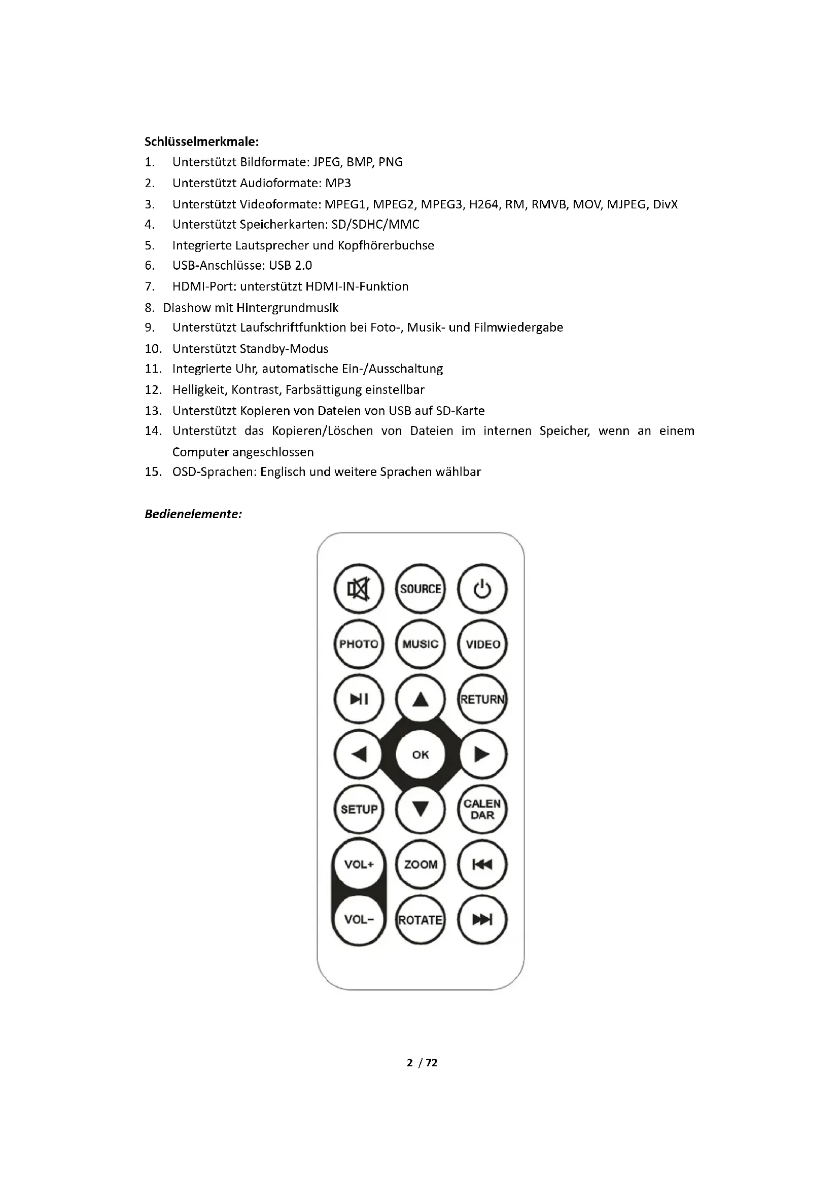 Hauptmenü: Unterstützt SD/SDHC/MMC und USB 2.0. Drücken Sie zum Aufrufen des Foto-, Musik-, Video-, Kalender- und Einstellungenmenüs. Drücken Sie zur Bestätigung der Auswahl die Taste OK. Hinweis: Es müssen sich unterstützte Foto-, Musik- oder Videodateien auf der Speicherkarte oder dem USB-Gerät befinden.4 / 72 Bildmodus: Markieren Sie im Hauptmenü Photo, drücken Sie zur Auswahl von USB oder Speicherkarte OK und drücken Sie RETURN, um den Miniaturbildmodus aufzurufen. Drücken Sie zur Auswahl des Bildes für die Wiedergabe und drücken Sie zur Bestätigung OK.