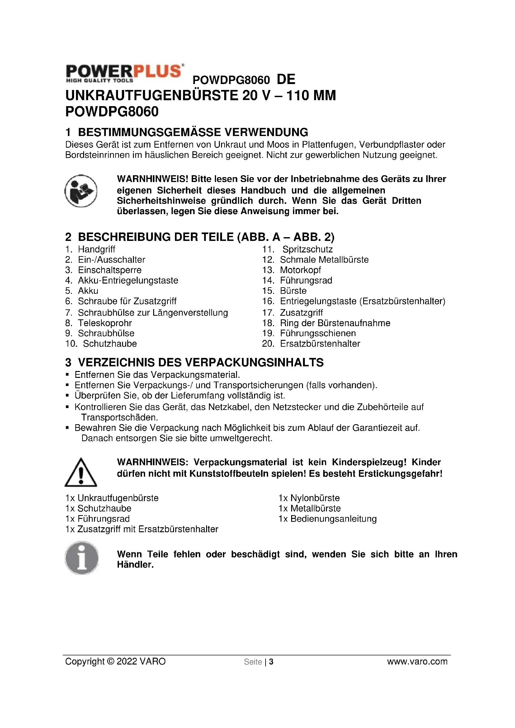 - Bewahren Sie die Verpackung nach Möglichkeit bis zum Ablauf der Garantiezeit auf. Danach entsorgen Sie sie bitte umweltgerecht. WARNHINWEIS: Verpackungsmaterial ist kein Kinderspielzeug! Kinder dürfen nicht mit Kunststoffbeuteln spielen! Es besteht Erstickungsgefahr! 1x Unkrautfugenbürste 1x Schutzhaube 1x Führungsrad 1x Zusatzgriff mit Ersatzbürstenhalter 1x Nylonbürste 1x Metallbürste 1x Bedienungsanleitung Wenn Teile fehlen oder beschädigt sind, wenden Sie sich bitte an Ihren Händler.POWDPG8060 DE Copyright © 2022 VARO Seite | 4 www.varo.com 4 SYMBOLE In dieser Anleitung und/oder auf dem Gerät werden folgende Symbole verwendet: