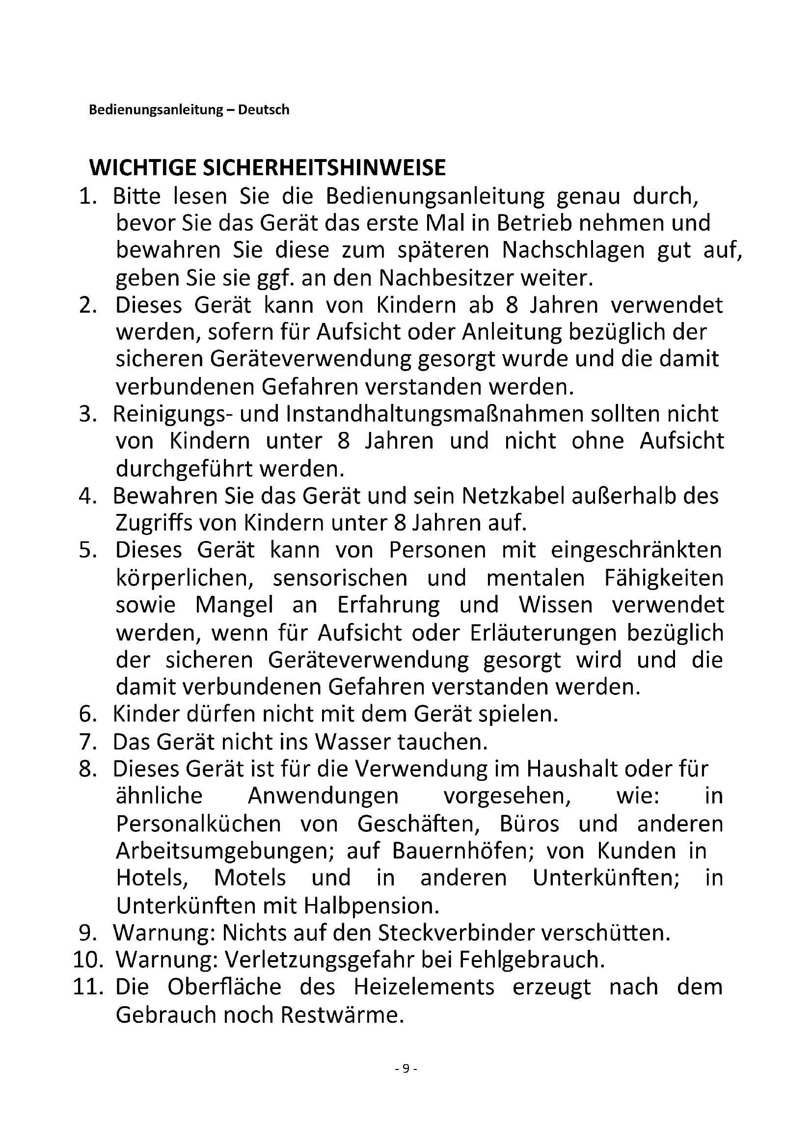 8. Dieses Gerät ist für die Verwendung im Haushalt oder für