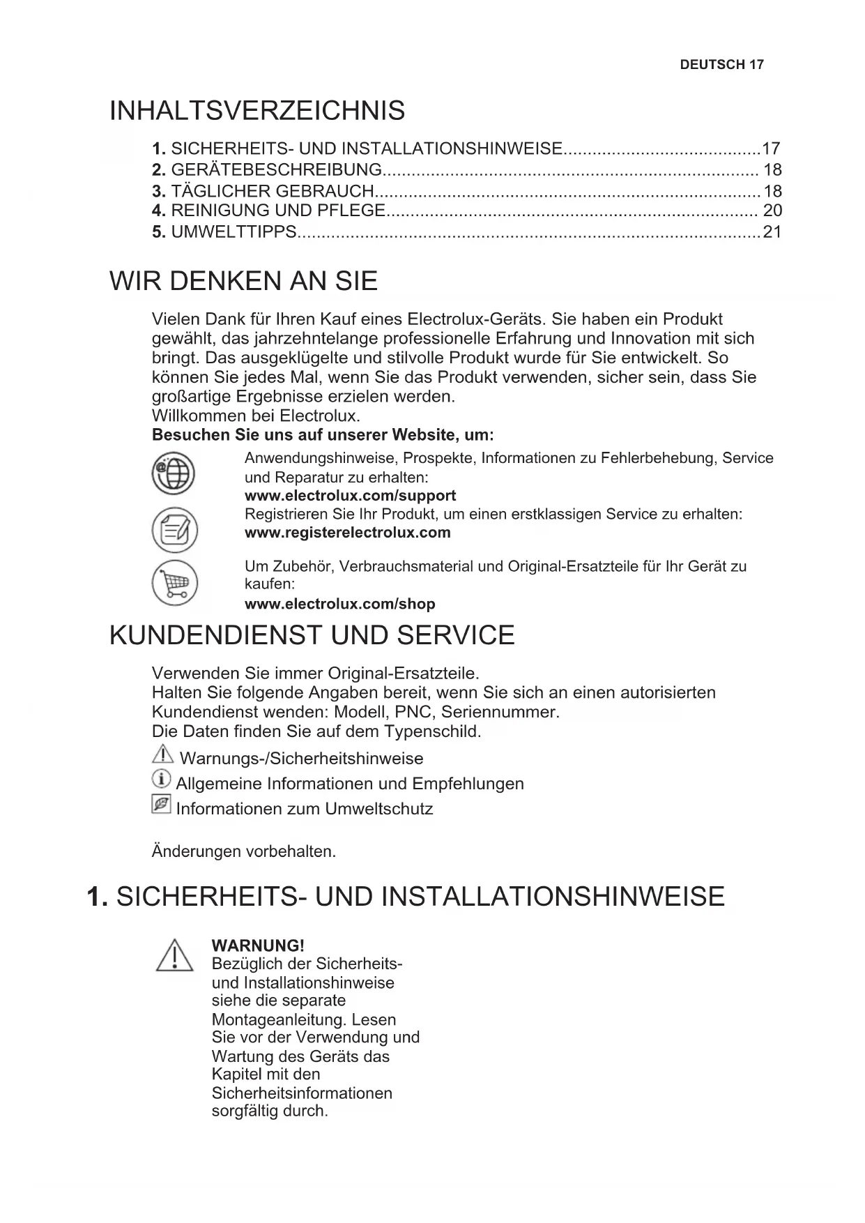 Vielen Dank für Ihren Kauf eines Electrolux-Geräts. Sie haben ein Produkt gewählt, das jahrzehntelange professionelle Erfahrung und Innovation mit sich bringt. Das ausgeklügelte und stilvolle Produkt wurde für Sie entwickelt. So können Sie jedes Mal, wenn Sie das Produkt verwenden, sicher sein, dass Sie großartige Ergebnisse erzielen werden. Willkommen bei Electrolux. Besuchen Sie uns auf unserer Website, um: Anwendungshinweise, Prospekte, Informationen zu Fehlerbehebung, Service und Reparatur zu erhalten: www.electrolux.com/support Registrieren Sie Ihr Produkt, um einen erstklassigen Service zu erhalten: www.registerelectrolux.com Um Zubehör, Verbrauchsmaterial und Original-Ersatzteile für Ihr Gerät zu kaufen: www.electrolux.com/shop