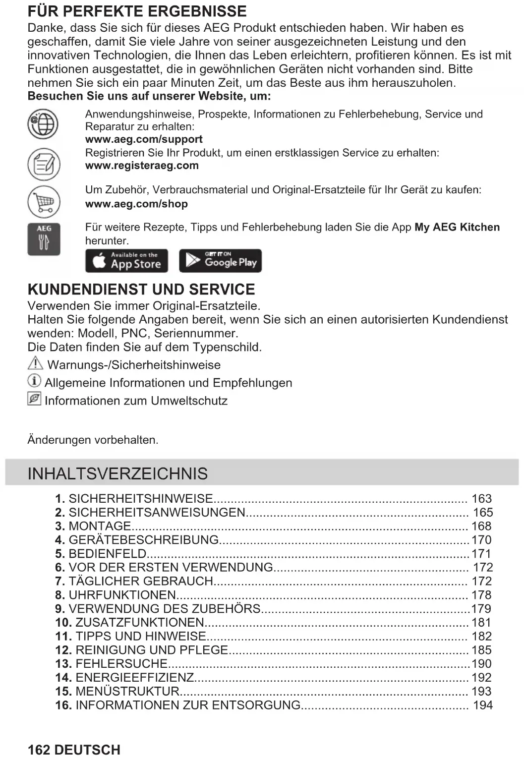 Danke, dass Sie sich für dieses AEG Produkt entschieden haben. Wir haben es geschaffen, damit Sie viele Jahre von seiner ausgezeichneten Leistung und den innovativen Technologien, die Ihnen das Leben erleichtern, profitieren können. Es ist mit Funktionen ausgestattet, die in gewöhnlichen Geräten nicht vorhanden sind. Bitte nehmen Sie sich ein paar Minuten Zeit, um das Beste aus ihm herauszuholen. Besuchen Sie uns auf unserer Website, um: Anwendungshinweise, Prospekte, Informationen zu Fehlerbehebung, Service undReparatur zu erhalten:www.aeg.com/supportRegistrieren Sie Ihr Produkt, um einen erstklassigen Service zu erhalten:www.registeraeg.comUm Zubehör, Verbrauchsmaterial und Original-Ersatzteile für Ihr Gerät zu kaufen:www.aeg.com/shopFür weitere Rezepte, Tipps und Fehlerbehebung laden Sie die App My AEG Kitchenherunter.