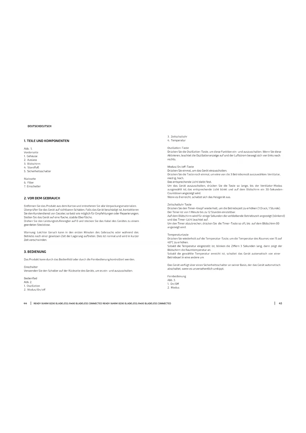 Veuillez lire les instructions suivantes avec attention avant d’utiliser l’appareil. Gardez bien ce manuel pour de futures références ou pour tout nouvel utilisateur. Assurez-vous que le voltage du réseau coïncide avec le voltage spécié sur l’étiquette de classication de l’appareil et que la prise possède une connexion à terre. Ne recouvrez pas l’entrée ni la sortie d’air pendant le fonctionnement de l’appareil. Maintenez une distance minimale de 65 cm de chaque côté, en face et derrière entre l’appareil et autres objets ou murs. N’insérez ni ne laissez des objets pénétrer par les orices de ventilation. Cela pourrait provoquer des décharges électriques, des incendies ou abîmer le produit. N’utilisez pas l’appareil dans des ambiantes sales. Ne placez pas le produit près de sources de chaleur, substances inammables, surfaces mouillées où des gouttes d’eau pourraient tomber et ne le laissez pas entrer en contact avec de l’eau ni avec aucun autre liquide. La surface du produit peut atteindre des températures très élevées pendant le fonctionnement. Utilisez la poignée du produit pour le déplacer. N’essayez pas de toucher un appareil qui est tombé dans l’eau, débranchez-le immédiatement. Inspectez le câble d’alimentation régulièrement pour rechercher1110 READY WARM 8200 BLADELESS/8400 BLADELESS CONNECTED READY WARM 8200 BLADELESS/8400 BLADELESS CONNECTED des dommages visibles. S’il présente des dommages, il doit être réparé par le Service Après-Vente Ociel de Cecotec pour éviter tout type de danger. Cet appareil a été conçu pour un usage exclusivement domestique. Ne l’utilisez pas à des ns commerciales ni industrielles. Ne laissez pas le câble toucher les surfaces chaudes N’essayez pas de réparer, de démonter ou de modier l’appareil. L’appareil ne possède pas de pièces qui puissent être réparées par l’utilisateur. N’utilisez pas le produit pour sécher des vêtements et ne le laissez pas sans surveillance lorsqu’il est en fonctionnement. N’introduisez ni ne laissez entrer aucun objet par l’entrée ou la sortie d’air, cela pourrait provoquer des décharges électriques, incendies ou abîmer le produit. Ne submergez pas le câble, la prise ni aucune autre partie du produit dans l’eau ni dans aucun autre liquide, ni n’exposez les connexions électriques à l’eau. Assurez-vous d’avoir les mains complètement sèches avant de toucher la prise ou d’allumer l’appareil. Ne placez pas le produit sous une prise de courant. N’utilisez pas le produit dans des salles de bain, laveries ni autres lieux similaires exposés à l’eau et à l’humidité. Éteignez et débranchez l’appareil de la prise de courant à chaque fois que vous ne l’utilisez pas et avant de le déplacer. Débranchez l’appareil en tirant sur la prise, pas sur le câble. Évitez d’utiliser des rallonges, elles pourraient surchauer et provoquer des incendies. L’appareil possède à l’intérieur des parties chaudes ou étincelantes. Ne l’utilisez pas dans des zones où des substances telles que l’essence, la peinture ou autres liquides inammables sont utilisés ou stockés. Cet appareil n’a pas été conçu pour être utilisé dans des salles de bains, dans des espaces humides où il y ait une machine à laver. Ne placez pas l’appareil dans des lieux où il puisse tomber ou où de l’eau pourrait l’atteindre. La télécommande sans l possède une batterie au lithium-ion, maintenez-la hors de portée des enfants. En cas d’ingestion, veillez contacter un médecin. Pour éviter des fuites de la batterie, extrayez la batterie de la télécommande si vous n’allez pas l’utiliser pendant une longue période de temps. L’appareil ne doit pas être utilisé par des enfants de 0 à 8 ans. Il peut être utilisé par des enfants de 8 ans et plus s’ils sont surveillés constamment. Cet appareil peut être utilisé par des personnes aux capacités physiques, mentales ou sensorielles réduites, ou sans expérience ni connaissances si elles sont surveillées et/ou ont reçu les informations nécessaires à sa correcte utilisation et qu’elles ont bien compris les risques qu’il implique. Surveillez les enfants pour vous assurer qu’ils ne jouent pas avec l’appareil. Une surveillance stricte est nécessaire si le produit est utilisé par ou à côté des enfants. Instructions pour les piles. Maintenez les piles hors de portée des enfants et des animaux, si elles sont ingérées, elles pourraient causer des problèmes de santé. En cas d’ingestion, consultez votre médecin immédiatement. En cas de fuite du liquide des piles, évitez le contact avec la peau, les yeux et les muqueuses. En cas de contact avec de l’acide, lavez immédiatement les1312 READY WARM 8200 BLADELESS/8400 BLADELESS CONNECTED READY WARM 8200 BLADELESS/8400 BLADELESS CONNECTED zones aectées avec de l’eau en abondance et contactez votre médecin le plus rapidement possible. Assurez-vous que les contacts des piles dans l’appareil soient propres avant de les insérer. Nettoyez-les si nécessaire. Utilisez uniquement le type de pile indiqué dans les spécications techniques. Changez toutes les piles à la fois. N’utilisez pas de piles diérentes. Faites attention à la polarité des piles lorsque vous allez les remplacer (+/-). Retirez les piles de l’appareil lorsqu’elles sont usées ou lorsque vous n’allez plus utiliser l’appareil pendant longtemps. Les piles ne doivent pas être rechargées, jetées au feu ni court- circuitées. N’enlevez pas l’emballage en plastique des piles. SICHERHEITSHINWEISE Lesen Sie die folgenden Hinweise aufmerksam durch, bevor Sie das Produkt verwenden. Bewahren Sie die Bedienungsanleitung zum Nachschlagen oder für künftige Benutzer gut auf. Vergewissern Sie sich, dass die Netzspannung mit der auf dem Typenschild des Gerätes angegebenen Spannung übereinstimmt und dass die Steckd