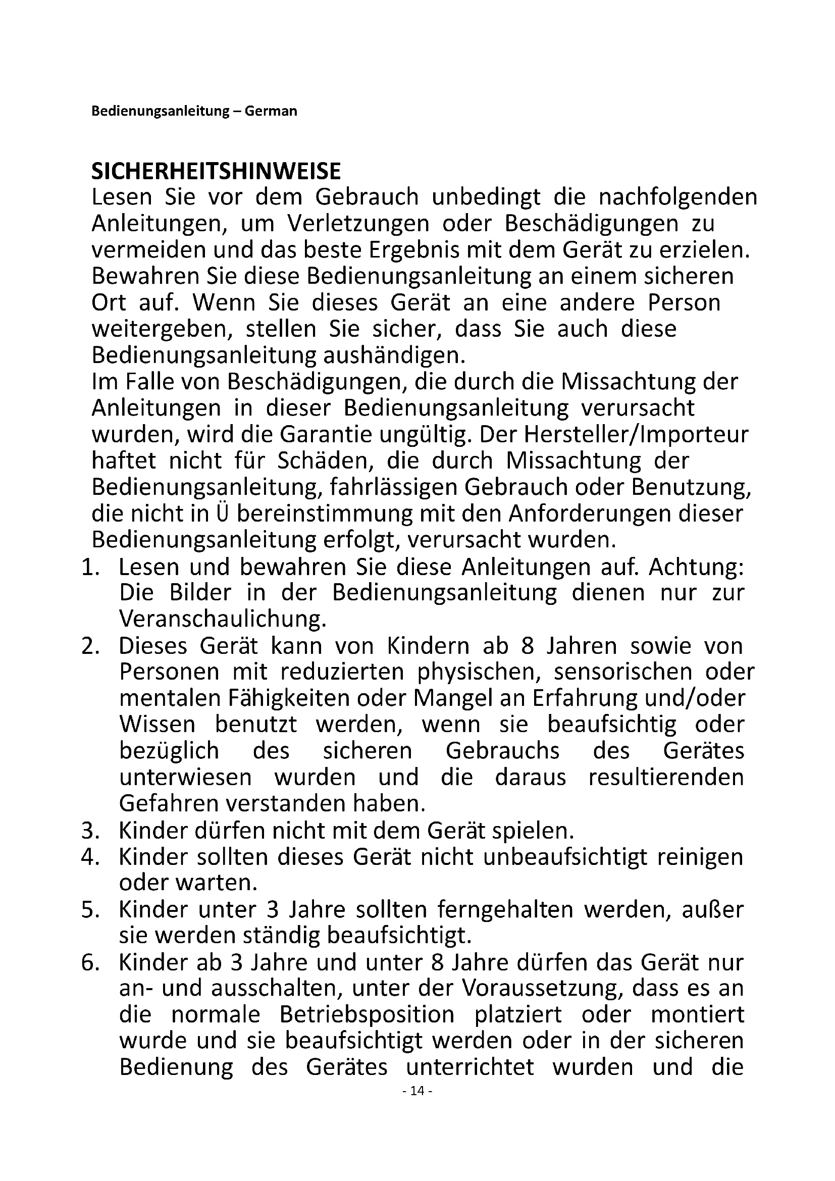 6. Kinder ab 3 Jahre und unter 8 Jahre dürfen das Gerät nur