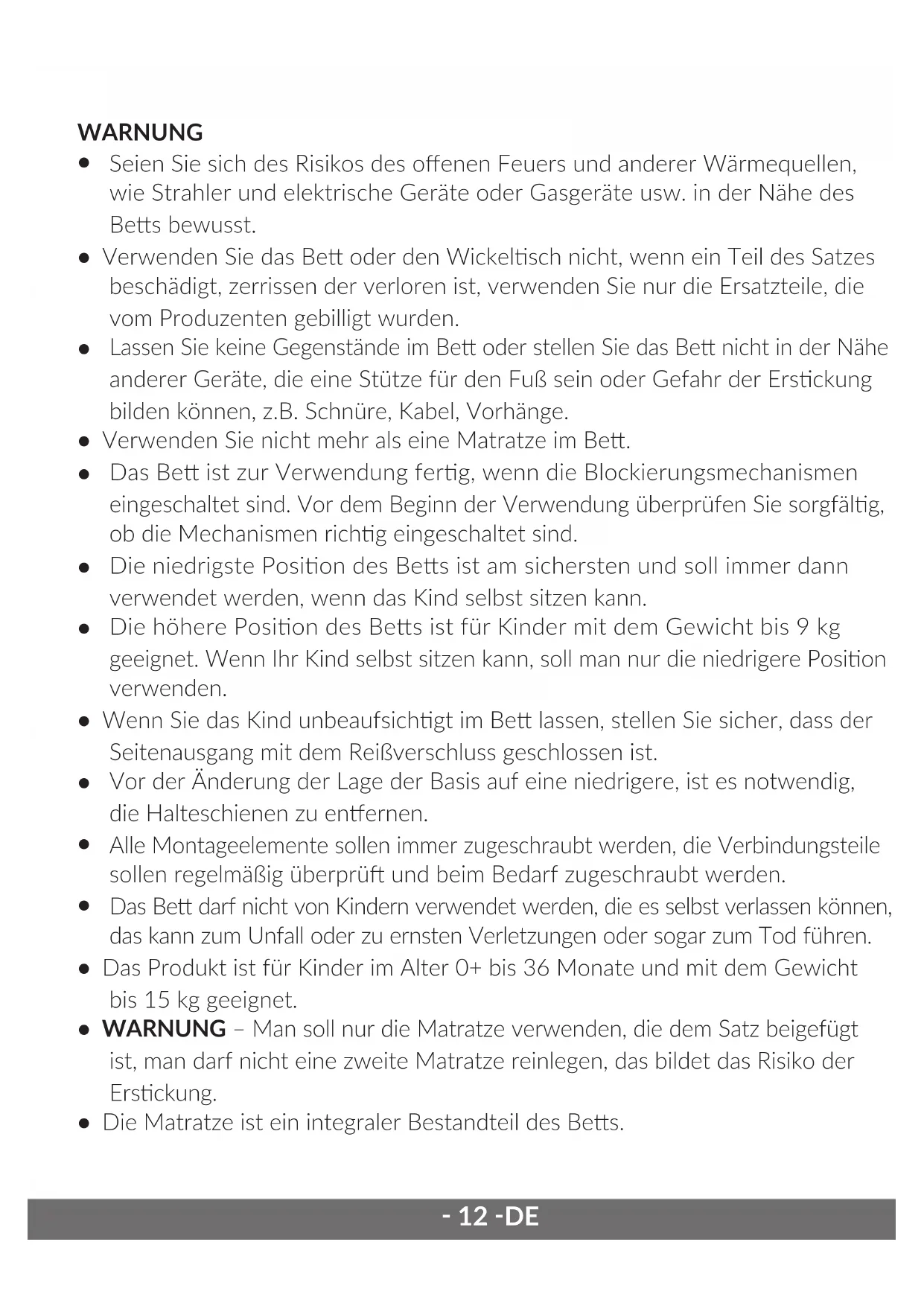 - WARNUNG – Man soll nur die Matratze verwenden, die dem Satz beigefügt ist, man darf nicht eine zweite Matratze reinlegen, das bildet das Risiko der Ersckung.