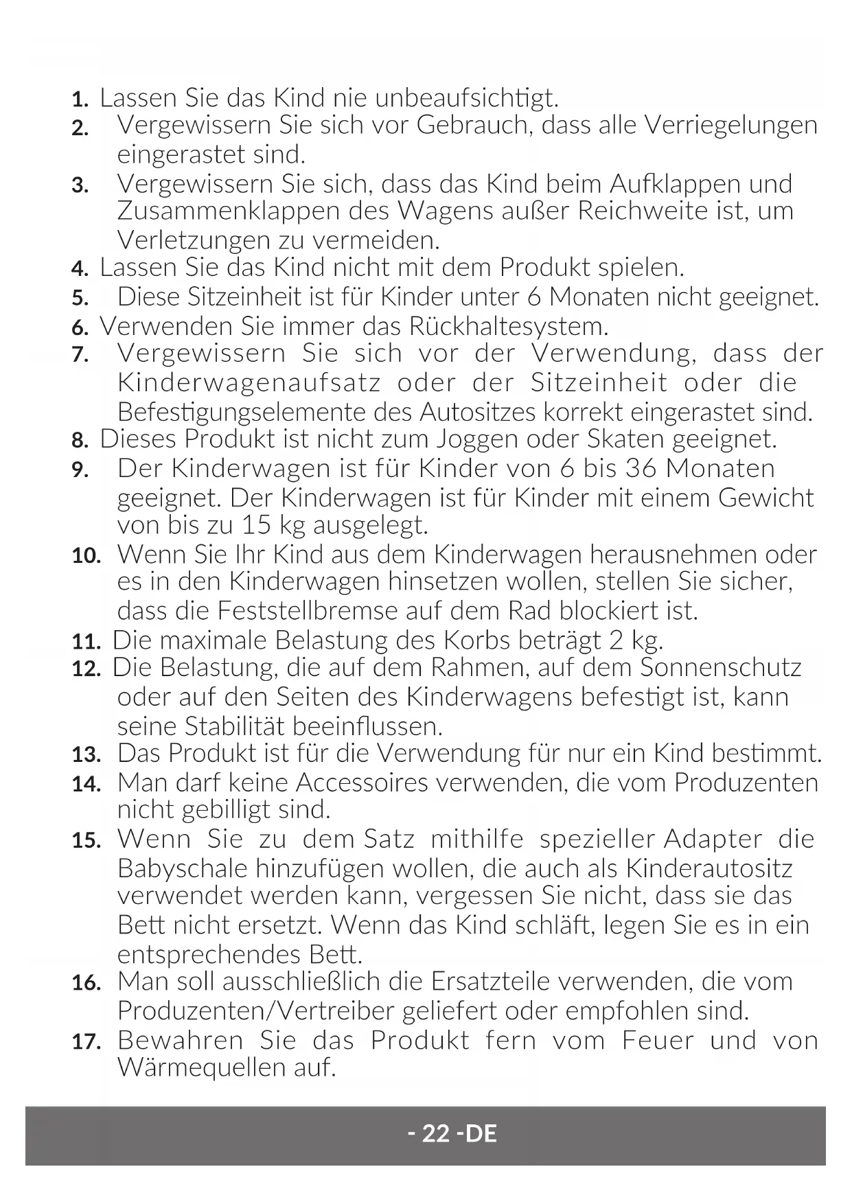 Man soll in die Babywanne keine zusätzliche Matratze einlegen.‑ 24 ‑DE Liste der Teile des Kindersportwagens (Abb. A, B)