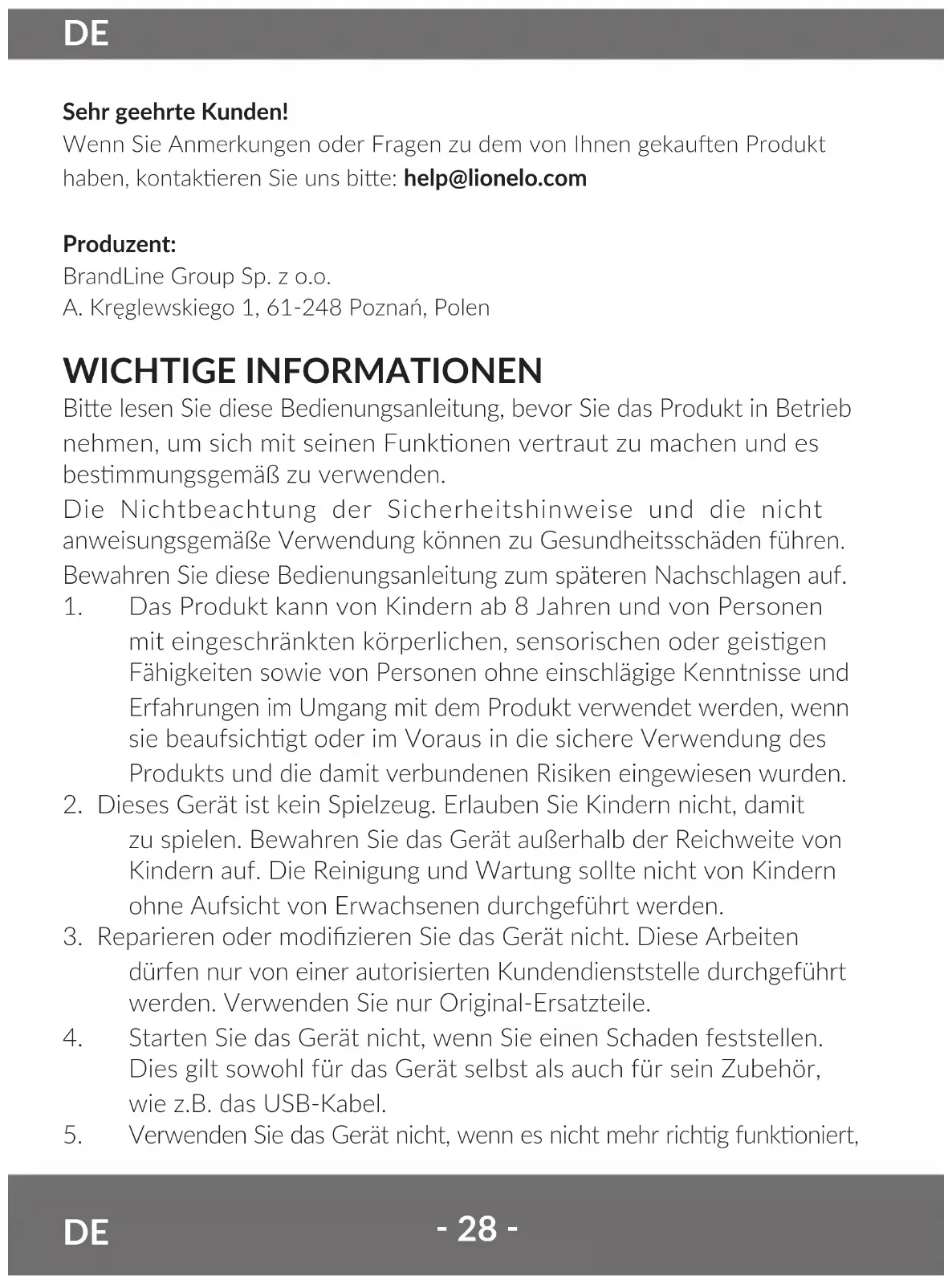 Sehr geehrte Kunden! Wenn Sie Anmerkungen oder Fragen zu dem von Ihnen gekauen Produkt haben, kontakeren Sie uns bie: help@lionelo.com Produzent: BrandLine Group Sp. z o.o. A. Kręglewskiego 1, 61-248 Poznań, Polen WICHTIGE INFORMATIONEN Bie lesen Sie diese Bedienungsanleitung, bevor Sie das Produkt in Betrieb nehmen, um sich mit seinen Funkonen vertraut zu machen und es besmmungsgemäß zu verwenden. Die Nichtbeachtung der Sicherheitshinweise und die nicht anweisungsgemäße Verwendung können zu Gesundheitsschäden führen. Bewahren Sie diese Bedienungsanleitung zum späteren Nachschlagen auf.