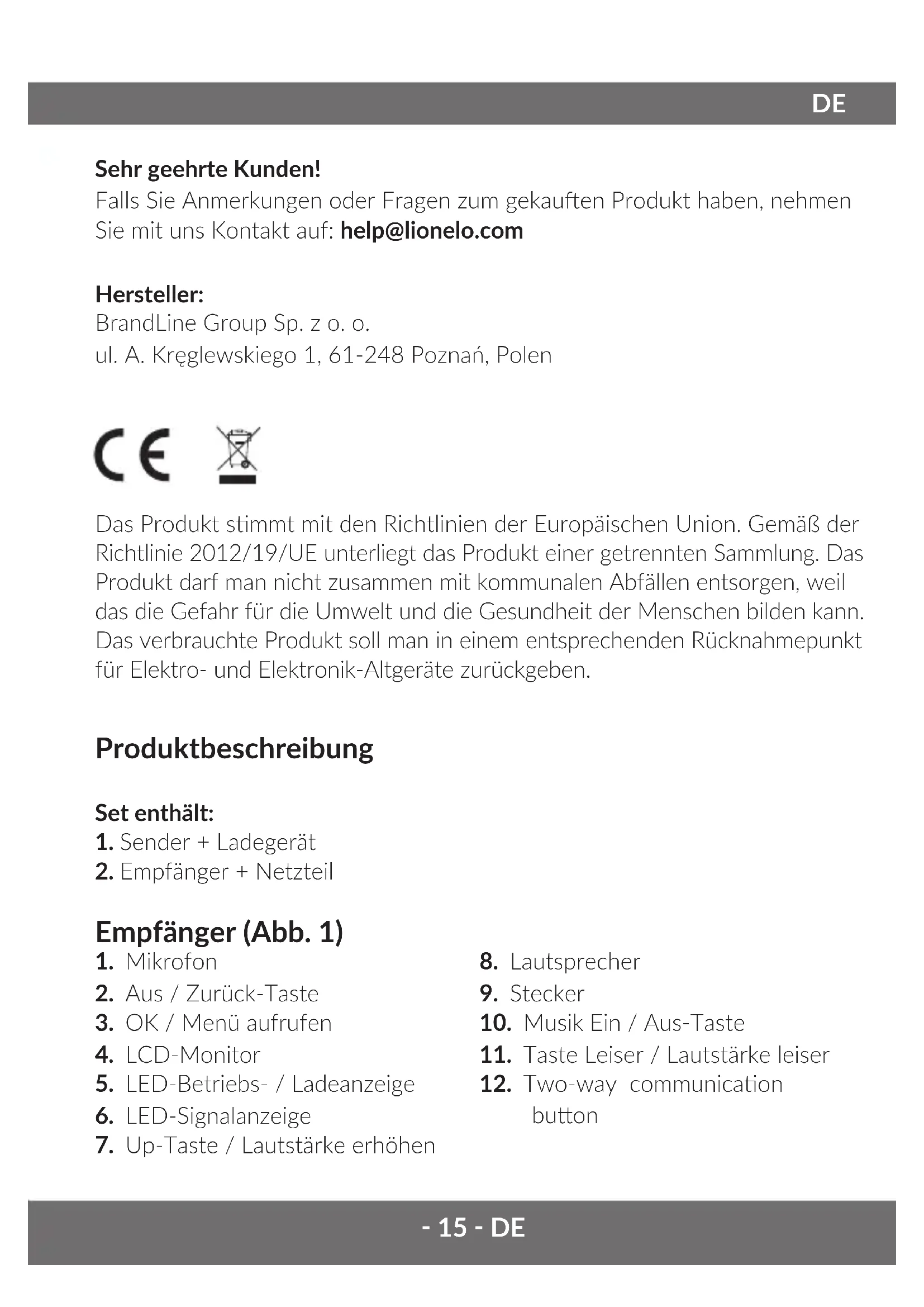 Sehr geehrte Kunden! Falls Sie Anmerkungen oder Fragen zum gekauen Produkt haben, nehmen Sie mit uns Kontakt auf: help@lionelo.com Hersteller: BrandLine Group Sp. z o. o. ul. A. Kręglewskiego 1, 61-248 Poznań, Polen Das Produkt smmt mit den Richtlinien der Europäischen Union. Gemäß der Richtlinie 2012/19/UE unterliegt das Produkt einer getrennten Sammlung. Das Produkt darf man nicht zusammen mit kommunalen Abfällen entsorgen, weil das die Gefahr für die Umwelt und die Gesundheit der Menschen bilden kann. Das verbrauchte Produkt soll man in einem entsprechenden Rücknahmepunkt für Elektro- und Elektronik-Altgeräte zurückgeben. Produktbeschreibung Set enthält: