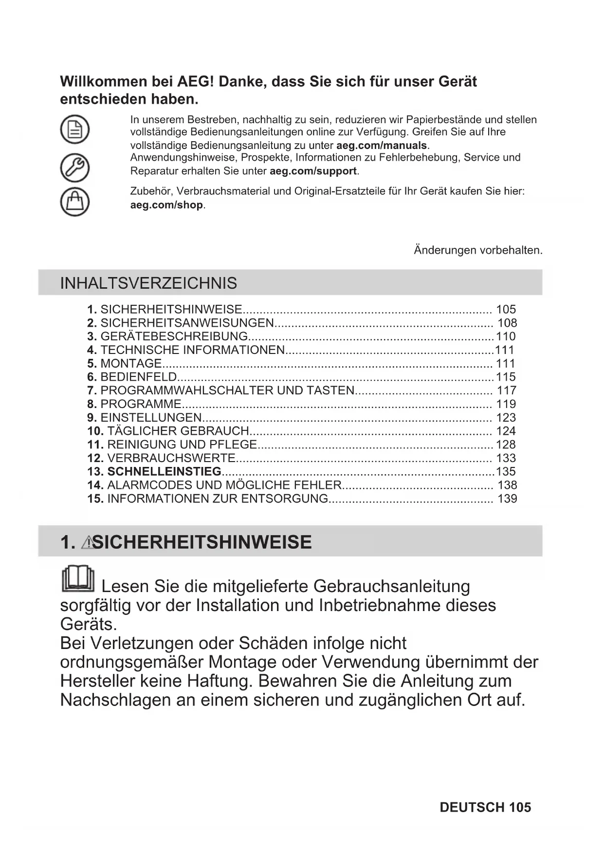 Recyclez les matériaux portant le symbole . Placez l’emballage dans les conteneurs appropriés pour le recycler. Contribuez à la protection de l’environnement et de la santé humaine en recyclant les déchets des appareils électriques et électroniques. Ne jetez pas les appareils marqués du symbole avec les déchets ménagers. Rapportez ce produit à votre centre de recyclage local ou renseignez-vous auprès de votre mairie. Concerne la France uniquement : 104 FRANÇAISWillkommen bei AEG! Danke, dass Sie sich für unser Gerät entschieden haben. Table title.In unserem Bestreben, nachhaltig zu sein, reduzieren wir Papierbestände und stellen vollständige Bedienungsanleitungen online zur Verfügung. Greifen Sie auf Ihre vollständige Bedienungsanleitung zu unter aeg.com/manuals.Anwendungshinweise, Prospekte, Informationen zu Fehlerbehebung, Service und Reparatur erhalten Sie unter aeg.com/support.Zubehör, Verbrauchsmaterial und Original-Ersatzteile für Ihr Gerät kaufen Sie hier: aeg.com/shop.Änderungen vorbehalten. INHALTSVERZEICHNIS