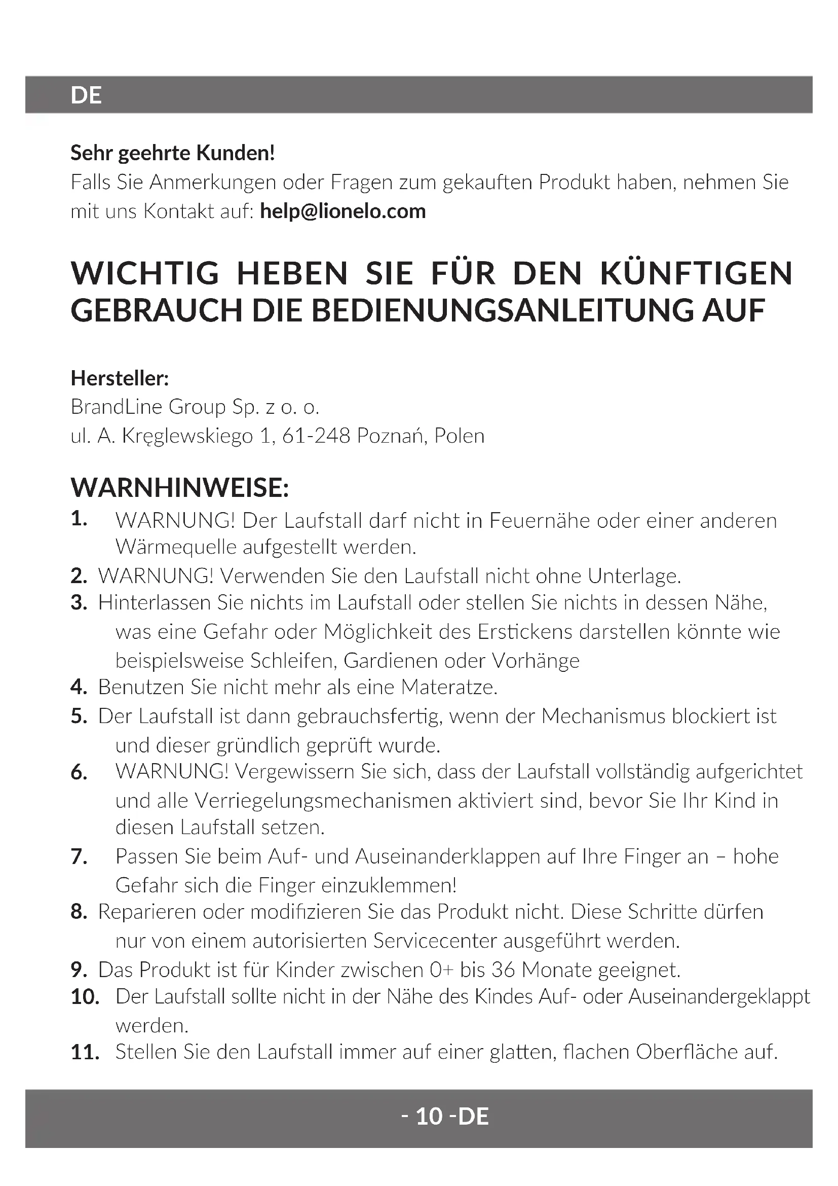 Sehr geehrte Kunden! Falls Sie Anmerkungen oder Fragen zum gekauen Produkt haben, nehmen Sie mit uns Kontakt auf: help@lionelo.com WICHTIG HEBEN SIE FÜR DEN KÜNFTIGEN