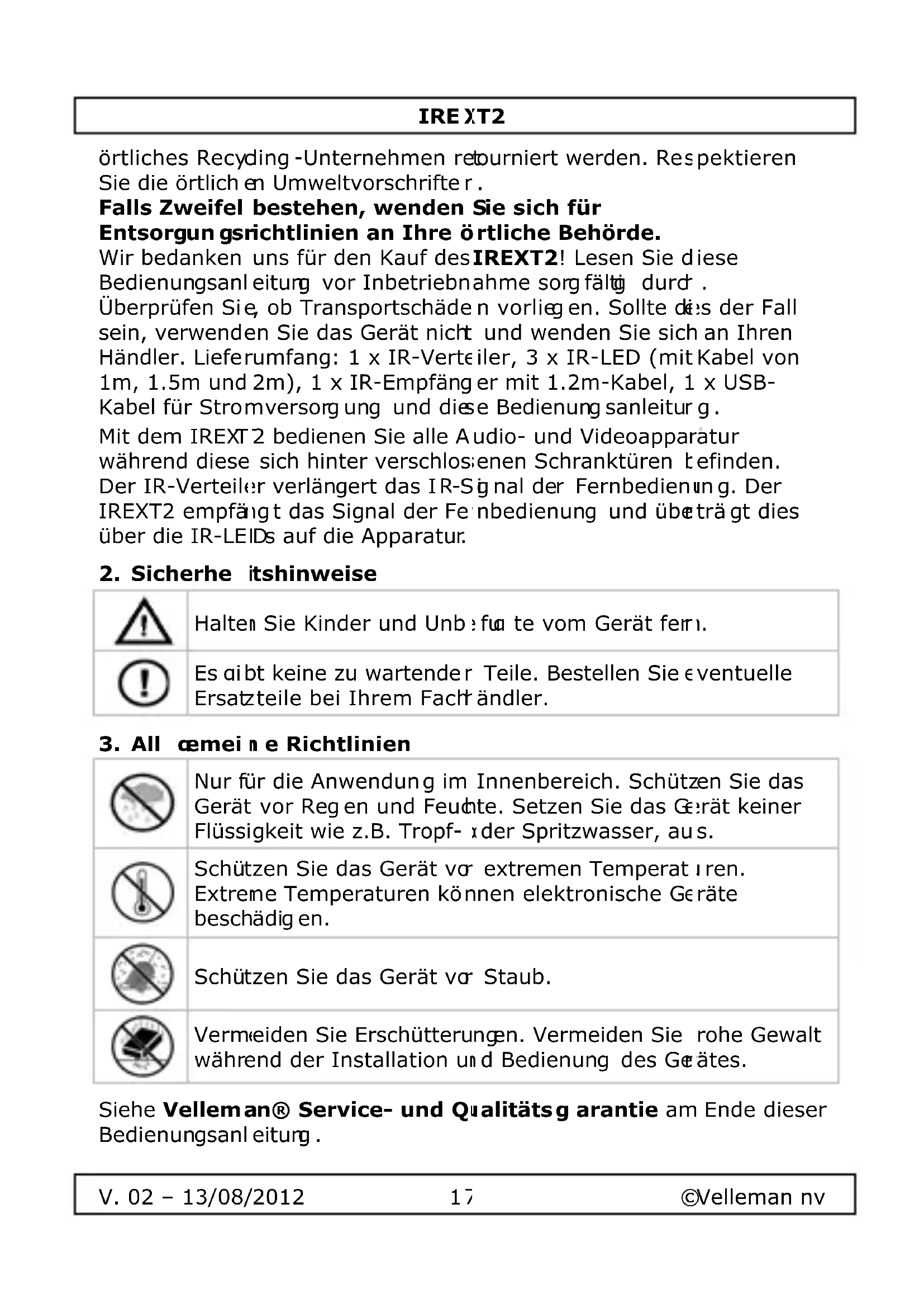 Stromversorgung 5VDC/100mA (über USB-Anschluss) Verbrauch max. 1 W Bereich ± 5 m (ideale Verhältnisse) Frequenz 30 ~ 60 kHz Abmessungen 102 x 46 x 19 mm Gewicht 35 g Verwenden Sie dieses Gerät nur mit originellen Zubehörteilen. Velleman NV übernimmt keine Haftung für Schaden oder Verletzungen bei (falscher) Anwendung dieses Gerätes. Für mehr Informationen zu diesem Produkt und die neueste Version dieser Bedienungsanleitung, siehe www.velleman.eu. Alle Änderungen ohne vorherige Ankündigung vorbehalten. © URHEBERRECHT Velleman NV besitzt das Urheberrecht für diese Bedienungsanleitung. Alle weltweiten Rechte vorbehalten. Ohne vorherige schriftliche Genehmigung des Urhebers ist es nicht gestattet, diese Bedienungsanleitung ganz oder in Teilen zu reproduzieren, zu kopieren, zu übersetzen, zu bearbeiten oder zu speichern.Velleman® Service and Quality Warranty Since its foundation in 1972, Velleman® acquired extensive experience in the electronics world and currently distributes its products in over 85 countries. All our products fulfil strict quality requirements and legal stipulations in the EU. In order to ensure the quality, our products regularly go through an extra quality check, both by an internal quality department and by specialized external organisations. If, all precautionary measures notwithstanding, problems should occur, please make appeal to our warranty (see guarantee conditions). General Warranty Conditions Concerning Consumer Products (for EU):