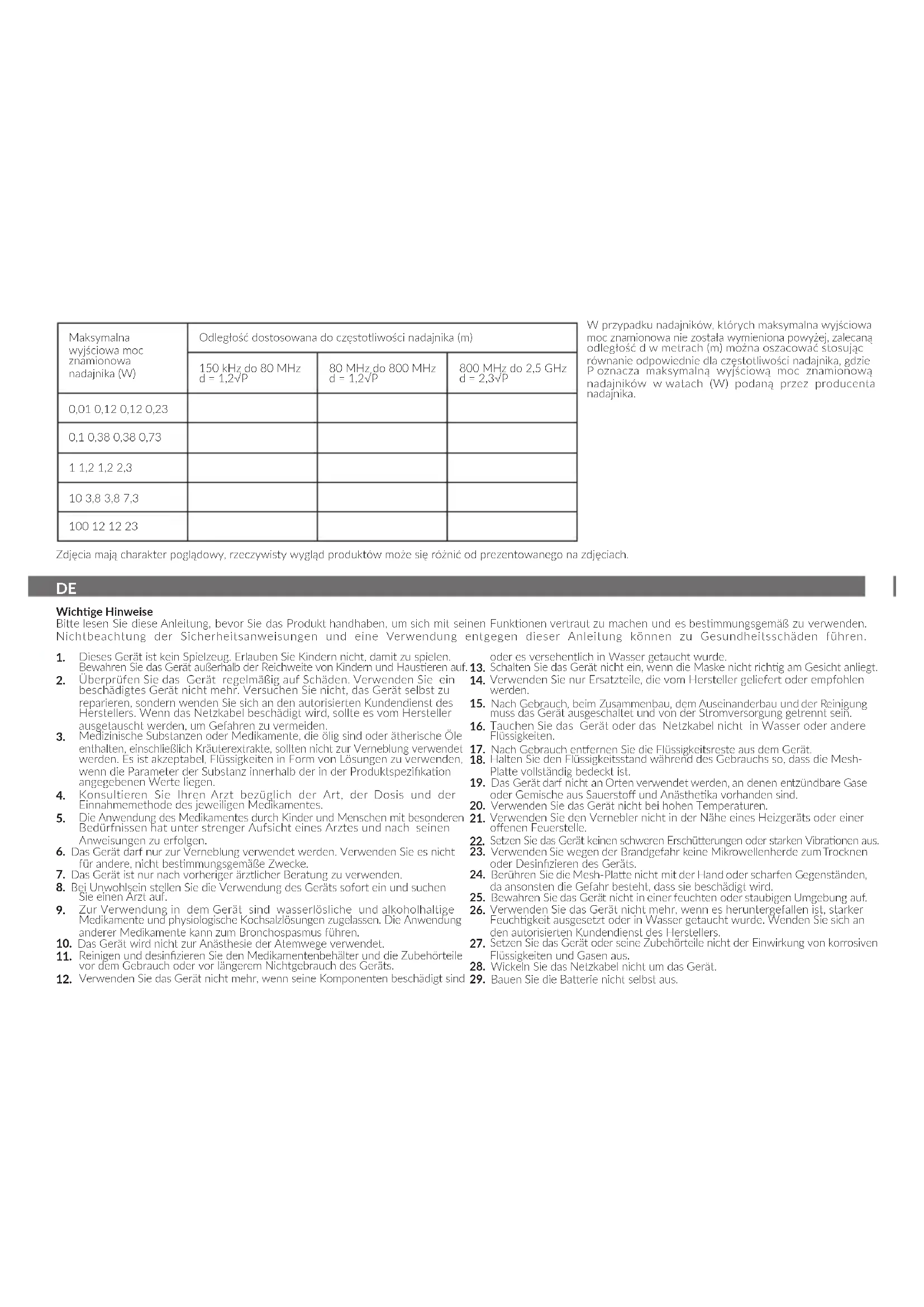 Empfohlener Abstand zwischen tragbaren Funkkommunikaonsgeräten und dem Vernebler Der Vernebler ist für die Verwendung in einer elektromagneschen Umgebung mit begrenzten Störungen durch Funkwellen geeignet. Der Benutzer des Verneblers kann zur Reduzierung von elektromagneschen Störungen beitragen, indem er einen Mindestabstand zwischen mobilen Funkkommunikationsgeräten (Sendern) und dem Vernebler gemäß den folgenden Empfehlungen entsprechend der maximalen Ausgangsnennleistung des jeweiligen Kommunikaonsgeräts einhält. Für Sender, deren maximale Ausgangsnennleistung oben nicht aufgeführt ist, kann der empfohlene Abstand d in Metern (m) anhand der für die jeweilige Senderfrequenz geeigneten Gleichung geschätzt werden, wobei P die vom Hersteller der Senders angegebene maximale Ausgangsnennleistung des Senders in Wa (W) ist. Die Bilder dienen nur zur Veranschaulichung, das tatsächliche Erscheinungsbild der Produkte kann von dem auf den Bildern gezeigten abweichen.Важная информация Пожалуйста, прочитайте это руководство, прежде чем приступить к работе с продуктом, чтобы ознакомиться с его функциями и использовать его по назначению. Несоблюдение инструкций по технике безопасности и использование не в соответствии с инструкцией может привести к причинению вреда здоровью.