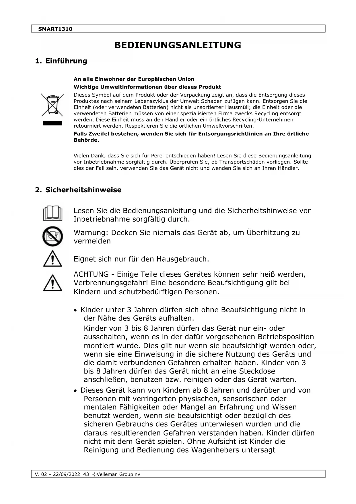 - Bewahren Sie diese Bedienungsanleitung für künftige Einsichtnahme auf.SMART1310