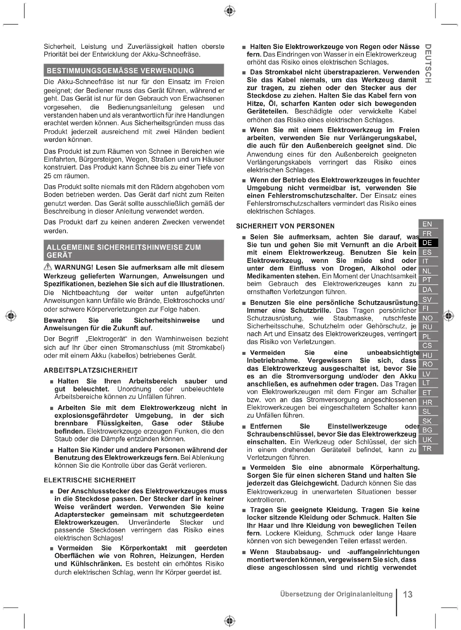 Übersetzung der Originalanleitung■ Gehen Sie umsichtig vor, um ein Ausrutschen oder Stürzen zu verhindern, vor allem wenn die Schneefräse rückwärts bewegt wird. ■ Stellen Sie die Gehäusehöhe des Sammlers so ein, dass dieser Kies oder Schotter passieren kann. ■ Versuchen Sie niemals, Justierungen an der Maschine vorzunehmen, während der Motor läuft. ■ Das Gerät kann Hände und Füße abtrennen und Gegenstände schleudern. Bei Nichtbeachtung der folgenden Sicherheitsanweisungen können ernsthafte Verletzungen die Folge sein. ■ Vergessen Sie nie, dass der Benutzer verantwortlich ist für Unfälle und Gefahren, die an Eigentum Fremder oder an anderen Personen entstehen könnte. VORBEREITUNG ■ Untersuchen Sie den Bereich, in dem die Maschine verwendet werden soll gründlich, und entfernen Sie alle Fußmatten, Bretter, Drähte und andere Gegenstände. ■ Kuppeln Sie alle Kupplungen aus und schalten Sie in den Leerlauf, bevor Sie den Motor starten. ■ Tragen Sie beim Betrieb der Maschine immer ausreichende Winterkleidung und rutschfestes Schuhwerk. Vermeiden Sie weite Kleidung, oder Kleidung mit Schnüren oder Bändern zu tragen; sie können sich in beweglichen Teilen verfangen. ■ Binden Sie lange Haare zurück, so dass diese sich über Schulterhöhe befinden um zu verhindern, dass sie sich in beweglichen Teilen verfangen. ■ Tragen Sie während des Betriebs oder beim Durchführen von Anpassungen oder Reparaturen immer eine Sicherheitsbrille oder einen Augenschutz, um die Augen vor Fremdkörpern zu schützen, die vom Gerät geschleudert werden können. ■ Stellen Sie vor jeder Benutzung sicher, dass alle Bedienelemente und Sicherheitsvorrichtung ordnungsgemäß funktionieren. Bedienen Sie das Gerät nicht, wenn der Ausschalter das Gerät nicht ausschaltet. ■ Prüfen Sie vor jedem Gebrauch, ob das Gehäuse unbeschädigt ist und ob Schutzvorrichtungen und Griffe vorhanden und ordnungsgemäß befestigt sind. VERWENDUNG ■ Benutzen Sie das Produkt nicht, wenn die Gefahr von Blitzschlag besteht. ■ Bewegen Sie Ihre Hände oder Füße nicht in die Nähe von rotierenden Teilen oder unter diese. Halten Sie den Bereich der Auswurföffnung stets frei. Halten Sie sich stets von allen Auswurföffnungen fern. ■ Gehen Sie bei Betrieb in der Nähe von Schotter- oder Kieswegen oder auf diesen mit extremer Vorsicht vor. Seien Sie Wachsam in Bezug auf versteckte Gefährdungen, wenn Sie in die Maschine in der Nähe von öffentlichen Straßen betrieben. ■ Um das Verletzungsrisiko bei Kontakt mit beweglichen Teilen zu verringern, schalten Sie das Gerät immer aus und nehmen Sie den Akkusatz heraus. Stellen Sie sicher, dass alle bewegliche Teile vollständig angehalten sind: ● Überprüfen Sie das Produkt auf Schäden, nachdem ein Fremdkörper getroffen wurde ● bevor Sie das Produkt reinigen oder eine Blockierung entfernen ● bevor Sie das Produkt unbeaufsichtigt zurücklassen ● bevor Sie das Produkt prüfen, reinigen oder daran arbeiten ● wenn das Produkt anfängt, ungewöhnlich zu vibrieren (sofort überprüfen um). Vibrationen sind allgemein ein Warnzeichen, das auf Störungen hinweist. ■ Benutzen Sie das Produkt quer entlang von Hängen, niemals nach oben und unten. Seien Sie extrem vorsichtig, wenn Sie auf Hängen die Fahrtrichtung wechseln. Versuchen Sie nicht, steile Hänge zu räumen. ■ Betreiben Sie das Produkt niemals ohne ordnungsgemäß angebrachte Schutzvorrichtungen, Abdeckungen oder andere Sicherheitssysteme. ■ Lenken Sie den Auswurf niemals in Richtung von Menschen oder in Bereiche, wo Sachschäden die Folge sein könnten Halten Sie unbeteiligte Personen aus dem Arbeitsbereich fern, insbesondere Kinder, aber auch Tiere. ■ Überlasten Sie die Kapazität der Maschine nicht, indem Sie versuchen, den Schnee zu schnell zu räumen. ■ Betreiben Sie die Maschine niemals bei hohen Transportgeschwindigkeiten auf rutschigen Oberflächen. Schauen Sie nach hinten und seien Sie vorsichtig, wenn Sie das Produkt im Rückwärtsgang betreiben. ■ Trennen Sie die Leistung vom Sammler/Laufrad, wenn die Schneefräse transportiert oder nicht verwendet wird. ■ Verwenden Sie ausschließlich original Ersatzteile, Zubehör und Aufsätze des Herstellers. ■ Bedienen Sie das Gerät niemals ohne gute Sicht bzw. ohne gutes Licht. Wahren Sie stets Standsicherheit und halten Sie sich gut an den Handgriffen fest. Gehen Sie stets im Schritttempo; laufen Sie niemals. ■ Stellen Sie das Produkt niemals auf einen Untergrund, außer einen sauberen und harten Untergrund, wenn der Motor läuft. Kies, Sand und anderes Geröll können mit dem Lufteinlass aufgenommen werden und in Richtung Benutzer oder Passanten geschleudert werden, und so schwere Verletzungen verursachen. ■ Betreiben Sie das Produkt niemals in der Nähe von Glasgehäusen, Kraftfahrzeugen, Fenstern oder Türen ohne die richtige Einstellung des Auswurföffnung. ■ Falls das Gerät herunterfällt, hart aufprallt oder abnormal zu vibrieren beginnt, schalten Sie das Gerät unverzüglich aus, untersuchen Sie es auf Schäden oder versuchen Sie, die Ursache für die Vibrationen herauszufinden. Jeder Schaden sollte durch den autorisierten Kundendienst ordnungsgemäß repariert oder ausgetauscht werden. ■ Betreiben Sie das Gerät nur bei Temperaturen zwischen 0 und 40 °C. ■ Bewahren Sie das Gerät bei einer Umgebungstemperatur von 0 bis 40 °C auf.