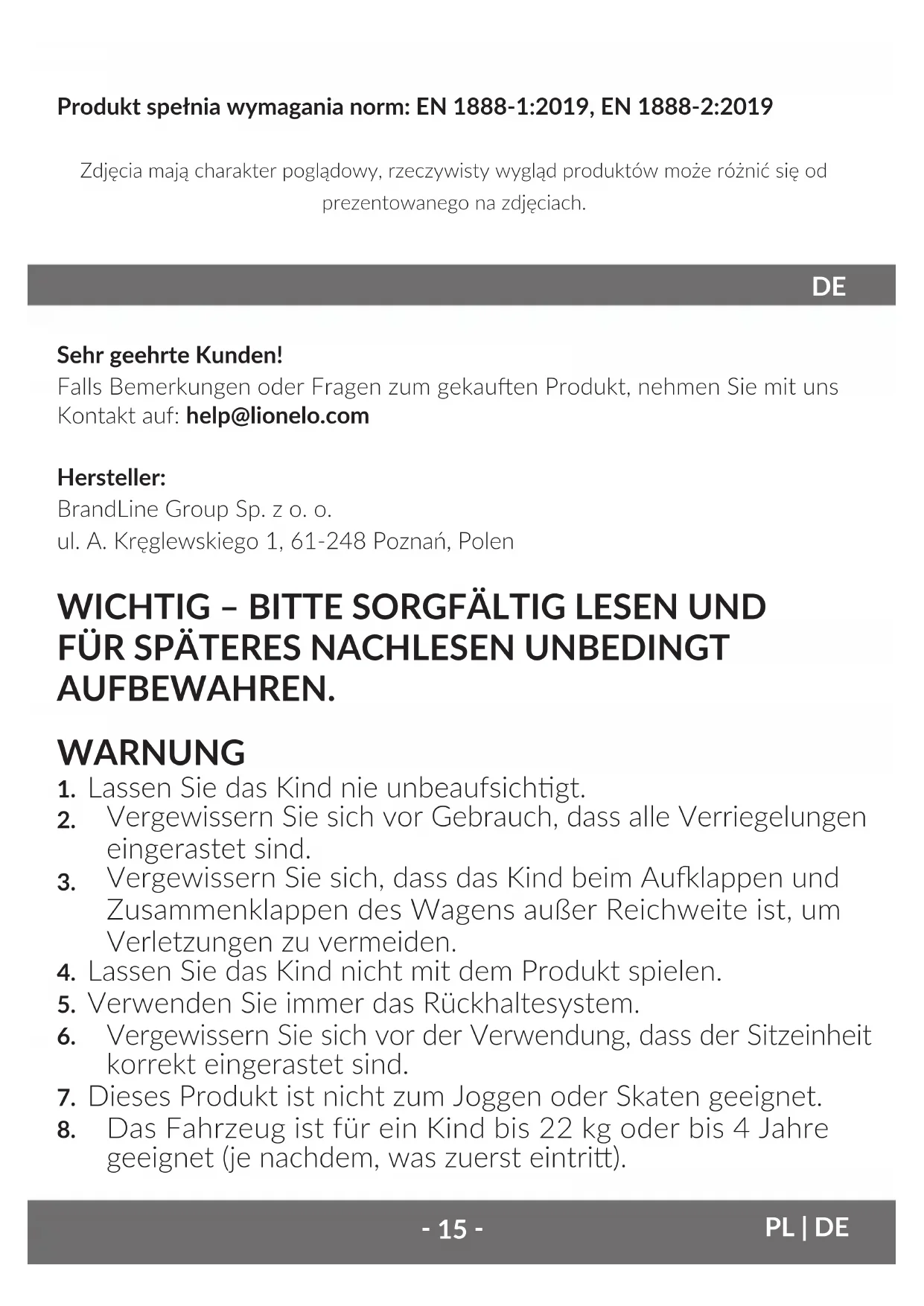 Sehr geehrte Kunden! Falls Bemerkungen oder Fragen zum gekauen Produkt, nehmen Sie mit uns Kontakt auf: help@lionelo.com Hersteller: BrandLine Group Sp. z o. o. ul. A. Kręglewskiego 1, 61-248 Poznań, Polen