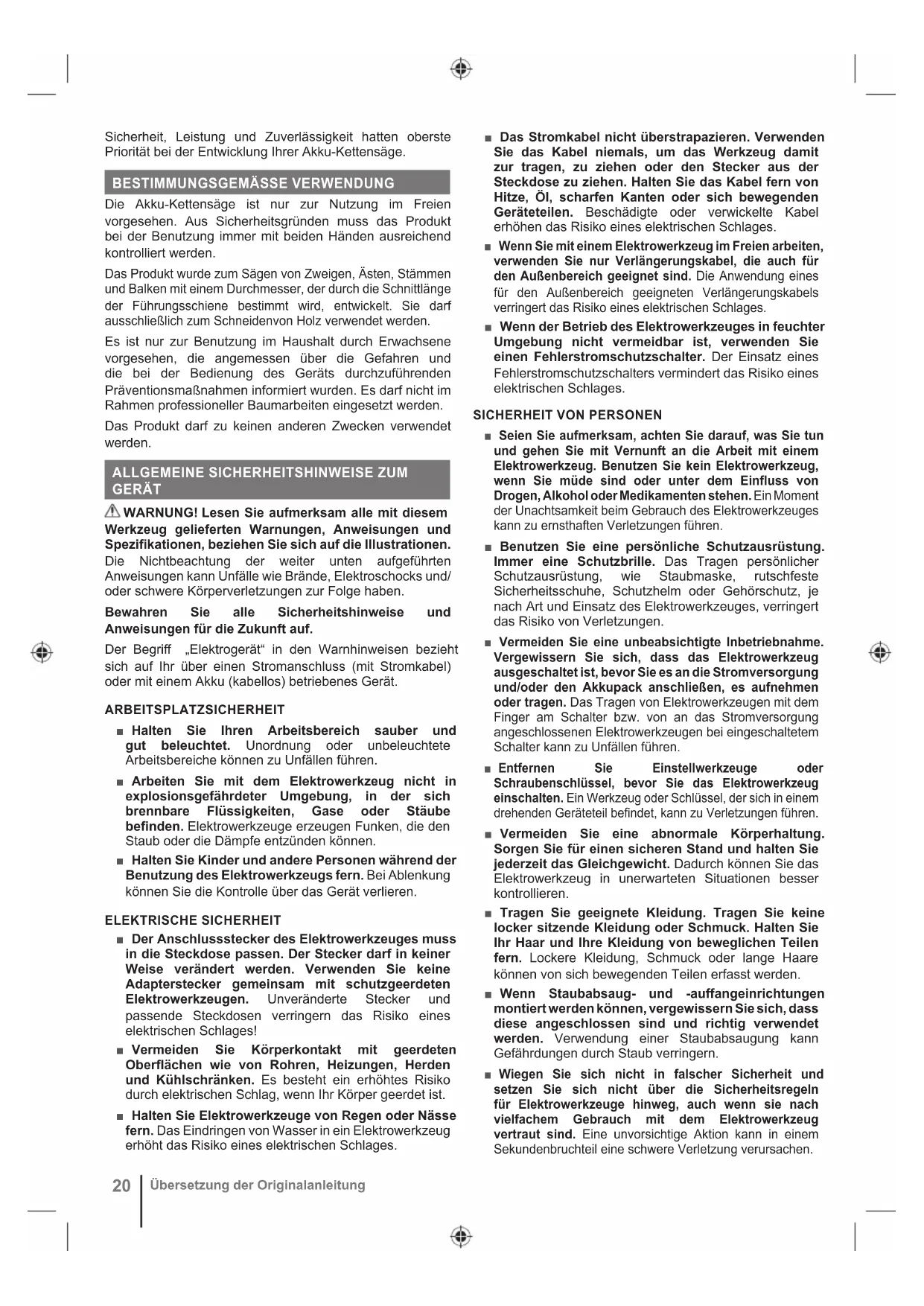 KETTENSÄGE ■ Halten Sie beim Betrieb der Kettensäge alle Körperteile von der Kettensäge fern. Vergewissern Sie sich vor dem Starten der Säge, dass die Sägekette nichts berührt. Beim Arbeiten mit einer Kettensäge kann ein Moment der Unachtsamkeit dazu führen, dass dass Bekleidung oder Körperteile von der Sägekette erfasst werden. ■ Halten Sie die Kettensäge immer mit der rechten Hand am hinteren Griff und mit der linken Hand am vorderen Griff. Ein Festhalten der Kettensäge in umgekehrter Arbeitshaltung erhöht das Risiko von Verletzungen und darf nicht angewendet werden. ■ Halten Sie die Kettensäge nur an den isolierten Greifflächen, da die Sägekette in Kontakt mit verborgener Verkabelung kommen kann. Wenn die Kettensäge Kontakt zu einem stromführenden Draht hat, kann das dazu führen, dass offenliegende Metallteile der Kettensäge ebenfalls Strom führen, und der Bediener könnte einen Stromschlag erleiden. ■ Tragen Sie einen Augenschutz Es wird empfohlen, weitere Schutzausrüstung für Gehör, Kopf, Hände, Beine und Füße zu tragen. Angemessene Schutzausrüstung verringert das persönliche Risiko durch umherfliegende Teile oder versehentliches Berühren der Kettensäge. ■ Bedienen Sie die Kettensäge nicht auf Bäumen, auf Leitern, von einem Dach aus oder auf einer anderen Art von instabilem Untergrund. Das Bedienen einer Kettensäge auf diese Art kann zu schwerwiegenden Verletzungen führen. ■ Achten Sie immer auf einen festen Stand, und benutzen Sie die Kettensäge nur, wenn Sie auf einer festem, sicherem und ebenem Grund stehen.22 Übersetzung der Originalanleitung Rutschige oder instabile Böden können zu einem Verlust des Gleichgewichts oder der Kontrolle über die Kettensäge führen. ■ Rechnen Sie beim Sägen eines Astes, der unter Spannung steht, dass er zurückschnellen kann. Wenn die Spannung in den Holzfasern gelöst wird, kann der unter Spannung stehende Ast dem Anwender entgegen schlagen und/oder zu einem Verlust der Kontrolle über die Kettensäge führen. ■ Seien Sie besonders vorsichtig beim Schneiden von Unterholz und jungen Bäumen. Das dünne Material kann sich in der Sägekette verfangen und auf Sie schlagen oder Sie aus dem Gleichgewicht bringen. ■ Tragen Sie die Kettensäge am vorderen Handgriff im ausgeschalteten Zustand und am Vordergriff, die Sägeketten von Ihrem Körper abgewandt. Schieben Sie bei Transport oder Lagerung immer die Abdeckung über die Führungsschiene. Sorgfältiger Umgang mit der Kettensäge verringert die Wahrscheinlichkeit einer versehentlichen Berührung mit der laufenden Sägekette. ■ Befolgen Sie die Anweisungen zum Schmieren, zum Spannen der Kette und zum Wechseln von Leiste und Kette. Eine unsachgemäß gespannte oder geschmierte Kette kann entweder reißen oder das Rückschlagrisiko erhöhen. ■ Nur Holz sägen. Die Kettensäge nicht für Arbeiten verwenden, für die sie nicht bestimmt ist. Beispielsweise: Nutzen Sie die Kettensäge nicht zum Schneiden von Metall, Kunststoff, Gemäuer oder Baumaterial, das nicht aus Holz besteht. Die Verwendung der Kettensäge für nicht bestimmungsgemäße Arbeiten kann zu gefährlichen Situationen führen. ■ Versuchen Sie nicht, einen Baum zu fällen, sofern Sie nicht die Risiken kennen und wissen, wie man sie vermeidet. Beim Fällen von Bäumen können der Bediener und umstehende Personen schwer verletzt werden. ■ Befolgen Sie beim Entfernen von eingeklemmtem Material, beim Aufbewahren und beim Warten der Kettensäge alle Anweisungen. Vergewissern Sie sich, dass das Gerät ausgeschaltet ist und der Akkupack entfernt wurde. Unerwartetes Ingangsetzen der Kettensäge bei der Wartung oder beim Entfernen von eingeklemmtem Material kann zu schwerwiegenden Personenschäden führen.