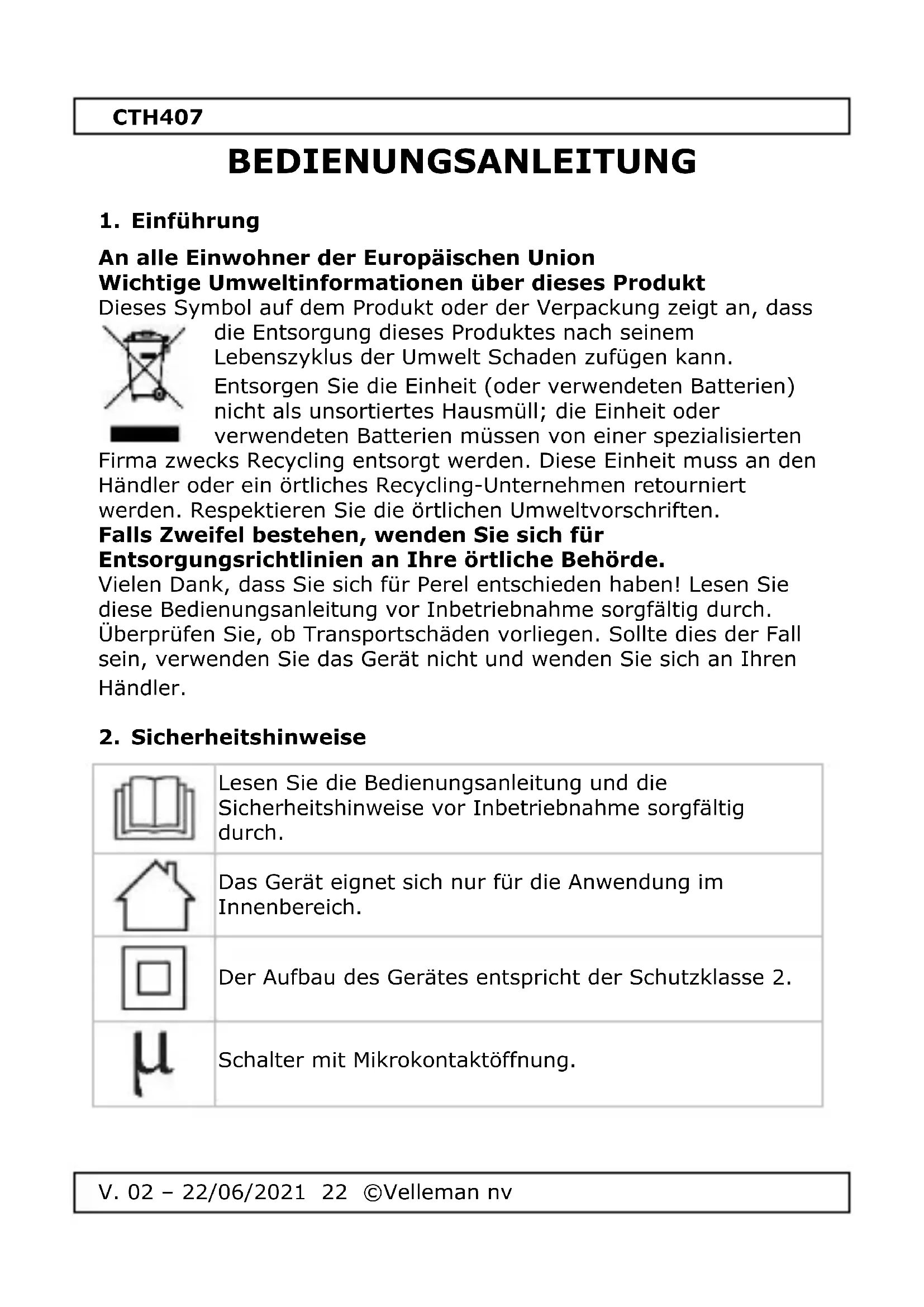Temperaturbereich .......................................... 5 °C - 30 °C Tmax. ..................................................................... 40 °C Kontrollschalter ....................................................... Relais Nennleistung .................................... 230 V~, 50 Hz, 7(3) A Abmessungen .............................................. 106 x 166 mm Gewicht ...................................................................157 g Verwenden Sie dieses Gerät nur mit originellen Zubehörteilen. Velleman NV übernimmt keine Haftung für Schaden oder Verletzungen bei (falscher) Anwendung dieses Gerätes. Für mehr Informationen zu diesem Produkt und die neueste Version dieser Bedienungsanleitung, siehe www.velleman.eu. Alle Änderungen ohne vorherige Ankündigung vorbehalten. © URHEBERRECHT Velleman NV besitzt das Urheberrecht für diese Bedienungsanleitung. Alle weltweiten Rechte vorbehalten. Ohne vorherige schriftliche Genehmigung des Urhebers ist es nicht gestattet, diese Bedienungsanleitung ganz oder in Teilen zu reproduzieren, zu kopieren, zu übersetzen, zu bearbeiten oder zu speichern.CTH407