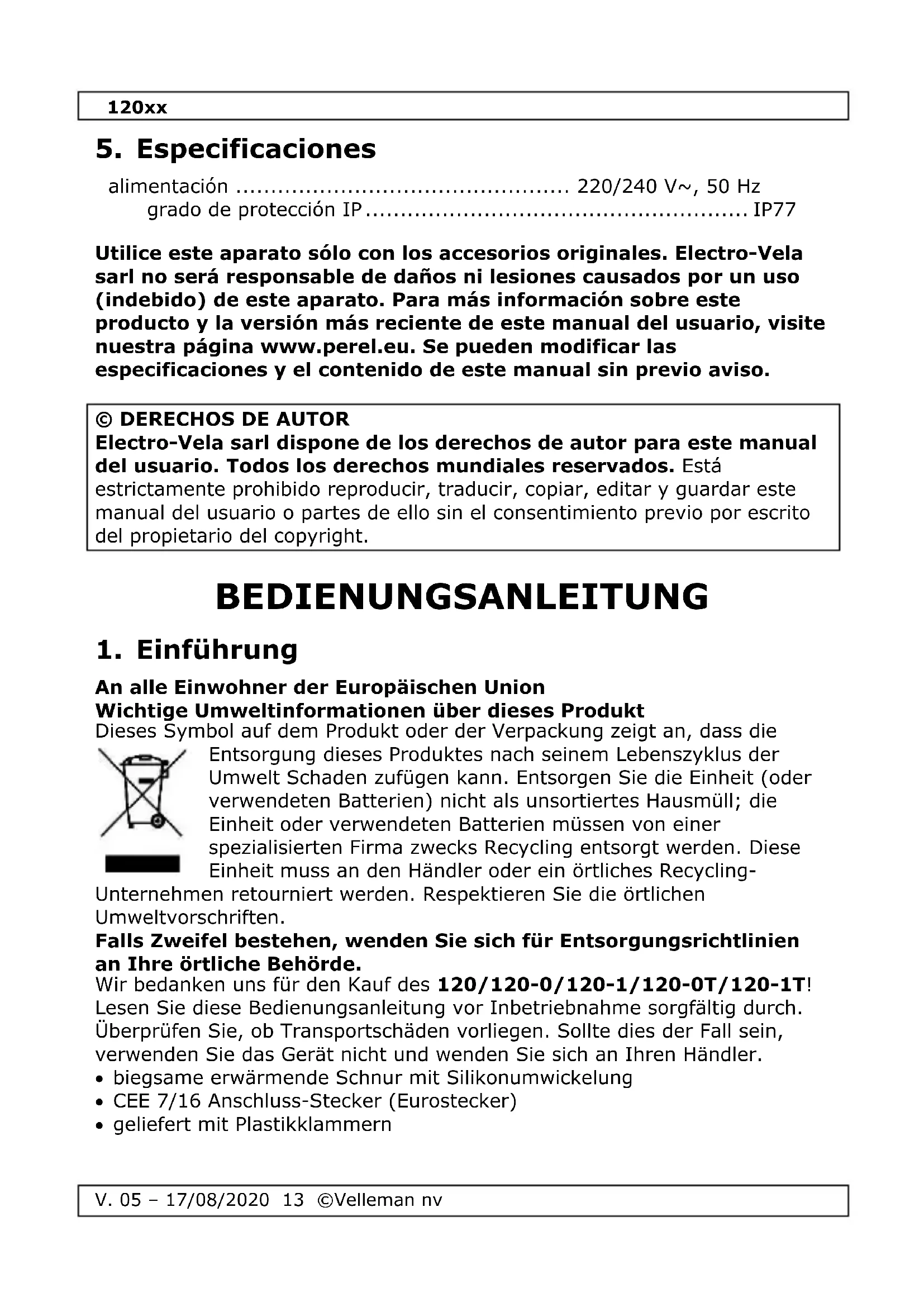 Stromversorgung .......................................... 220/240 V~, 50 Hz IP-Schutzart ..................................................................... IP77 Verwenden Sie dieses Gerät nur mit originellen Zubehörteilen. Electro-Vela sarl übernimmt keine Haftung für Schaden oder Verletzungen bei (falscher) Anwendung dieses Gerätes. Für mehr Informationen zu diesem Produkt und die neueste Version dieser Bedienungsanleitung, siehe www.perel.eu. Alle Änderungen ohne vorherige Ankündigung vorbehalten. © URHEBERRECHT Electro-Vela sarl besitzt das Urheberrecht für diese Bedienungsanleitung. Alle weltweiten Rechte vorbehalten. Ohne vorherige schriftliche Genehmigung des Urhebers ist es nicht gestattet, diese Bedienungsanleitung ganz oder in Teilen zu reproduzieren, zu kopieren, zu übersetzen, zu bearbeiten oder zu speichern.