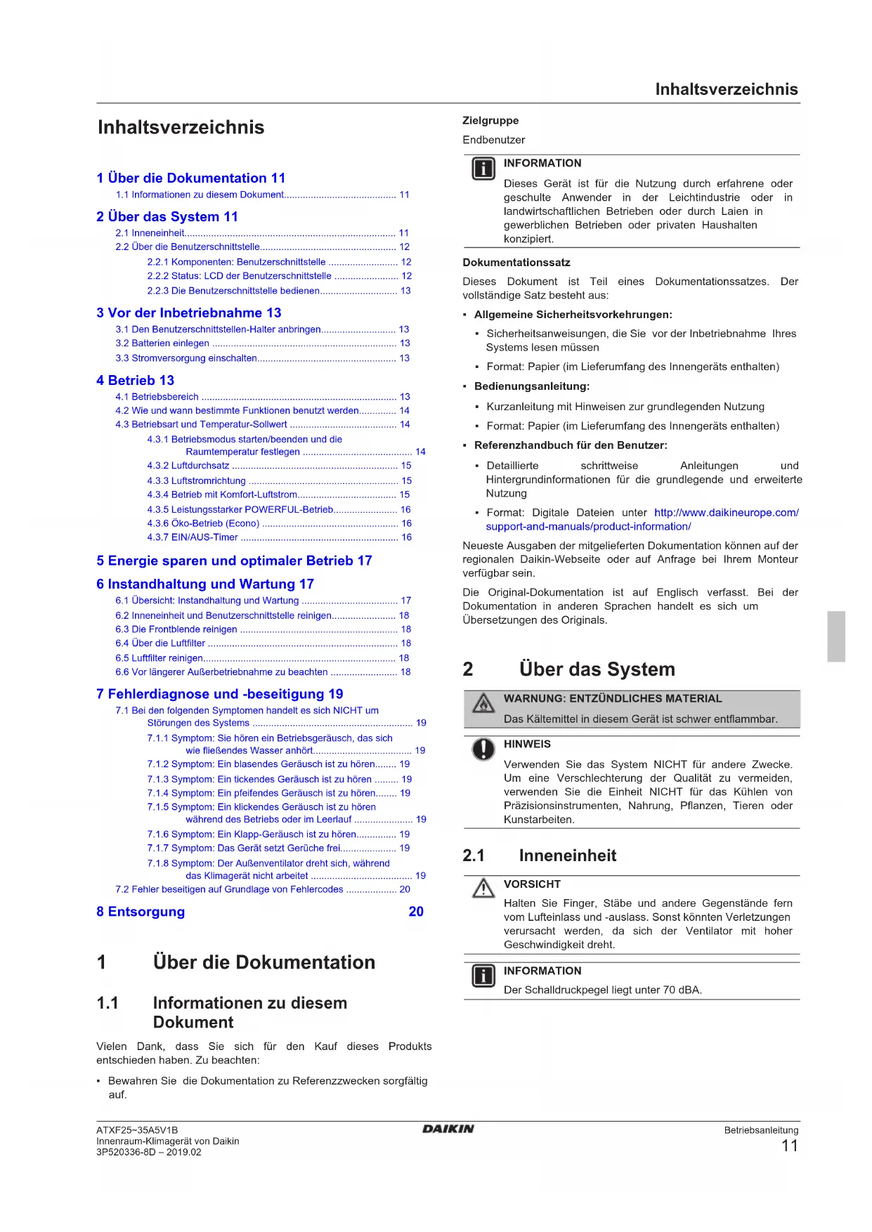 Innenraum-Klimagerät von Daikin 3P520336-8D – 2019.02 Inhaltsverzeichnis 1 Über die Dokumentation 11