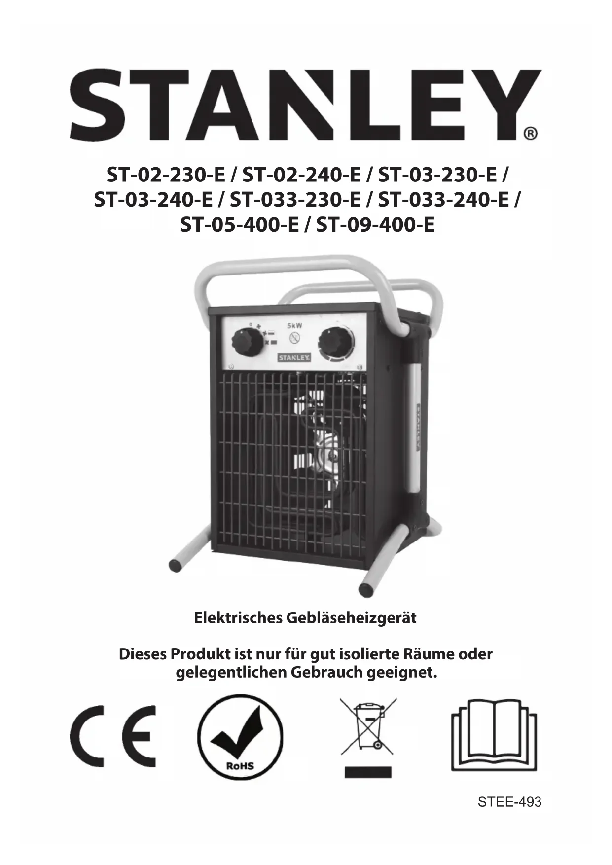 REPSTEE-493 Elektrisches Gebläseheizgerät Dieses Produkt ist nur für gut isolierte Räume oder gelegentlichen Gebrauch geeignet. ST-02-230-E / ST-02-240-E / ST-03-230-E / ST-03-240-E / ST-033-230-E / ST-033-240-E / ST-05-400-E / ST-09-400-ELASSEN SIE DAS HEIZGERÄT NIEMALS UNBEAUFSICHTIGT, WENN ES AN DAS STROMNETZ ANGESCHLOSSEN IST ODER