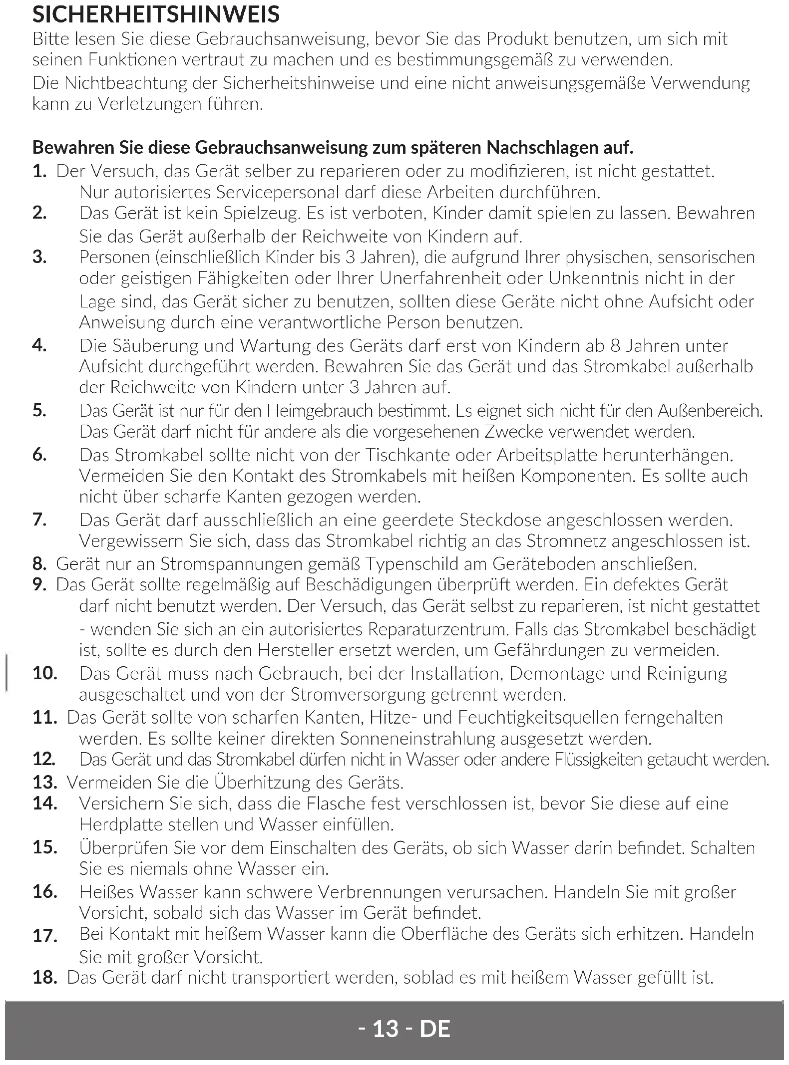 18. Das Gerät darf nicht transporert werden, soblad es mit heißem Wasser gefüllt ist.‑ 14 ‑DE