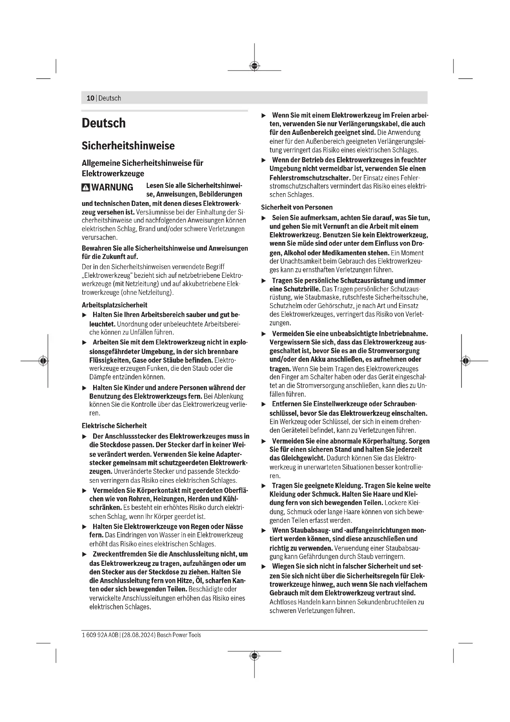 (44) (4) (32) (31) (33) (9) (5) (24) (25) Bosch Power Tools 1 609 92A A0B | (28.08.2024)10 | Deutsch Deutsch Sicherheitshinweise Allgemeine Sicherheitshinweise für Elektrowerkzeuge WARNUNG Lesen Sie alle Sicherheitshinwei- se, Anweisungen, Bebilderungen und technischen Daten, mit denen dieses Elektrowerk- zeug versehen ist. Versäumnisse bei der Einhaltung der Si- cherheitshinweise und nachfolgenden Anweisungen können elektrischen Schlag, Brand und/oder schwere Verletzungen verursachen. Bewahren Sie alle Sicherheitshinweise und Anweisungen für die Zukunft auf. Der in den Sicherheitshinweisen verwendete Begriff „Elektrowerkzeug“ bezieht sich auf netzbetriebene Elektro- werkzeuge (mit Netzleitung) und auf akkubetriebene Elek- trowerkzeuge (ohne Netzleitung). Arbeitsplatzsicherheit u Halten Sie Ihren Arbeitsbereich sauber und gut be- leuchtet. Unordnung oder unbeleuchtete Arbeitsberei- che können zu Unfällen führen. u Arbeiten Sie mit dem Elektrowerkzeug nicht in explo- sionsgefährdeter Umgebung, in der sich brennbare Flüssigkeiten, Gase oder Stäube befinden. Elektro- werkzeuge erzeugen Funken, die den Staub oder die Dämpfe entzünden können. u Halten Sie Kinder und andere Personen während der Benutzung des Elektrowerkzeugs fern. Bei Ablenkung können Sie die Kontrolle über das Elektrowerkzeug verlie- ren. Elektrische Sicherheit u Der Anschlussstecker des Elektrowerkzeuges muss in die Steckdose passen. Der Stecker darf in keiner Wei- se verändert werden. Verwenden Sie keine Adapter- stecker gemeinsam mit schutzgeerdeten Elektrowerk- zeugen. Unveränderte Stecker und passende Steckdo- sen verringern das Risiko eines elektrischen Schlages. u Vermeiden Sie Körperkontakt mit geerdeten Oberflä- chen wie von Rohren, Heizungen, Herden und Kühl- schränken. Es besteht ein erhöhtes Risiko durch elektri- schen Schlag, wenn Ihr Körper geerdet ist. u Halten Sie Elektrowerkzeuge von Regen oder Nässe fern. Das Eindringen von Wasser in ein Elektrowerkzeug erhöht das Risiko eines elektrischen Schlages. u Zweckentfremden Sie die Anschlussleitung nicht, um das Elektrowerkzeug zu tragen, aufzuhängen oder um den Stecker aus der Steckdose zu ziehen. Halten Sie die Anschlussleitung fern von Hitze, Öl, scharfen Kan- ten oder sich bewegenden Teilen. Beschädigte oder verwickelte Anschlussleitungen erhöhen das Risiko eines elektrischen Schlages. u Wenn Sie mit einem Elektrowerkzeug im Freien arbei- ten, verwenden Sie nur Verlängerungskabel, die auch für den Außenbereich geeignet sind. Die Anwendung einer für den Außenbereich geeigneten Verlängerungslei- tung verringert das Risiko eines elektrischen Schlages. u Wenn der Betrieb des Elektrowerkzeuges in feuchter Umgebung nicht vermeidbar ist, verwenden Sie einen Fehlerstromschutzschalter. Der Einsatz eines Fehler- stromschutzschalters vermindert das Risiko eines elektri- schen Schlages. Sicherheit von Personen u Seien Sie aufmerksam, achten Sie darauf, was Sie tun, und gehen Sie mit Vernunft an die Arbeit mit einem Elektrowerkzeug. Benutzen Sie kein Elektrowerkzeug, wenn Sie müde sind oder unter dem Einfluss von Dro- gen, Alkohol oder Medikamenten stehen. Ein Moment der Unachtsamkeit beim Gebrauch des Elektrowerkzeu- ges kann zu ernsthaften Verletzungen führen. u Tragen Sie persönliche Schutzausrüstung und immer eine Schutzbrille. Das Tragen persönlicher Schutzaus- rüstung, wie Staubmaske, rutschfeste Sicherheitsschuhe, Schutzhelm oder Gehörschutz, je nach Art und Einsatz des Elektrowerkzeuges, verringert das Risiko von Verlet- zungen. u Vermeiden Sie eine unbeabsichtigte Inbetriebnahme. Vergewissern Sie sich, dass das Elektrowerkzeug aus- geschaltet ist, bevor Sie es an die Stromversorgung und/oder den Akku anschließen, es aufnehmen oder tragen. Wenn Sie beim Tragen des Elektrowerkzeuges den Finger am Schalter haben oder das Gerät eingeschal- tet an die Stromversorgung anschließen, kann dies zu Un- fällen führen. u Entfernen Sie Einstellwerkzeuge oder Schrauben- schlüssel, bevor Sie das Elektrowerkzeug einschalten. Ein Werkzeug oder Schlüssel, der sich in einem drehen- den Geräteteil befindet, kann zu Verletzungen führen. u Vermeiden Sie eine abnormale Körperhaltung. Sorgen Sie für einen sicheren Stand und halten Sie jederzeit das Gleichgewicht. Dadurch können Sie das Elektro- werkzeug in unerwarteten Situationen besser kontrollie- ren. u Tragen Sie geeignete Kleidung. Tragen Sie keine weite Kleidung oder Schmuck. Halten Sie Haare und Klei- dung fern von sich bewegenden Teilen. Lockere Klei- dung, Schmuck oder lange Haare können von sich bewe- genden Teilen erfasst werden. u Wenn Staubabsaug- und -auffangeinrichtungen mon- tiert werden können, sind diese anzuschließen und richtig zu verwenden. Verwendung einer Staubabsau- gung kann Gefährdungen durch Staub verringern. u Wiegen Sie sich nicht in falscher Sicherheit und set- zen Sie sich nicht über die Sicherheitsregeln für Elek- trowerkzeuge hinweg, auch wenn Sie nach vielfachem Gebrauch mit dem Elektrowerkzeug vertraut sind. Achtloses Handeln kann binnen Sekundenbruchteilen zu schweren Verletzungen führen. 1 609 92A A0B | (28.08.2024) Bosch Power ToolsDeutsch | 11 Verwendung und Behandlung des Elektrowerkzeugs u Überlasten Sie das Elektrowerkzeug nicht. Verwenden Sie für Ihre Arbeit das dafür bestimmte Elektrowerk- zeug. Mit dem passenden Elektrowerkzeug arbeiten Sie besser und sicherer im angegebenen Leistungsbereich. u Benutzen Sie kein Elektrowerkzeug, dessen Schalter defekt ist. Ein Elektrowerkzeug, das sich nicht mehr ein- oder ausschalten lässt, ist gefährlich und muss repariert werden. u Ziehen Sie den Stecker aus der Steckdose und/oder entfernen Sie einen abnehmbaren Akku, bevor Sie Ge- räteeinstellungen vornehmen, Einsatzwerkzeugteile wechseln oder das Elektrowerkzeug weglegen. Diese Vorsichtsmaßnahme verhindert den unbeabsichtigten Start des Elektrowerkzeuges. u Bewahren Sie unbenutzte Elektrowerkzeuge außer- halb der Reichweite von Kinder