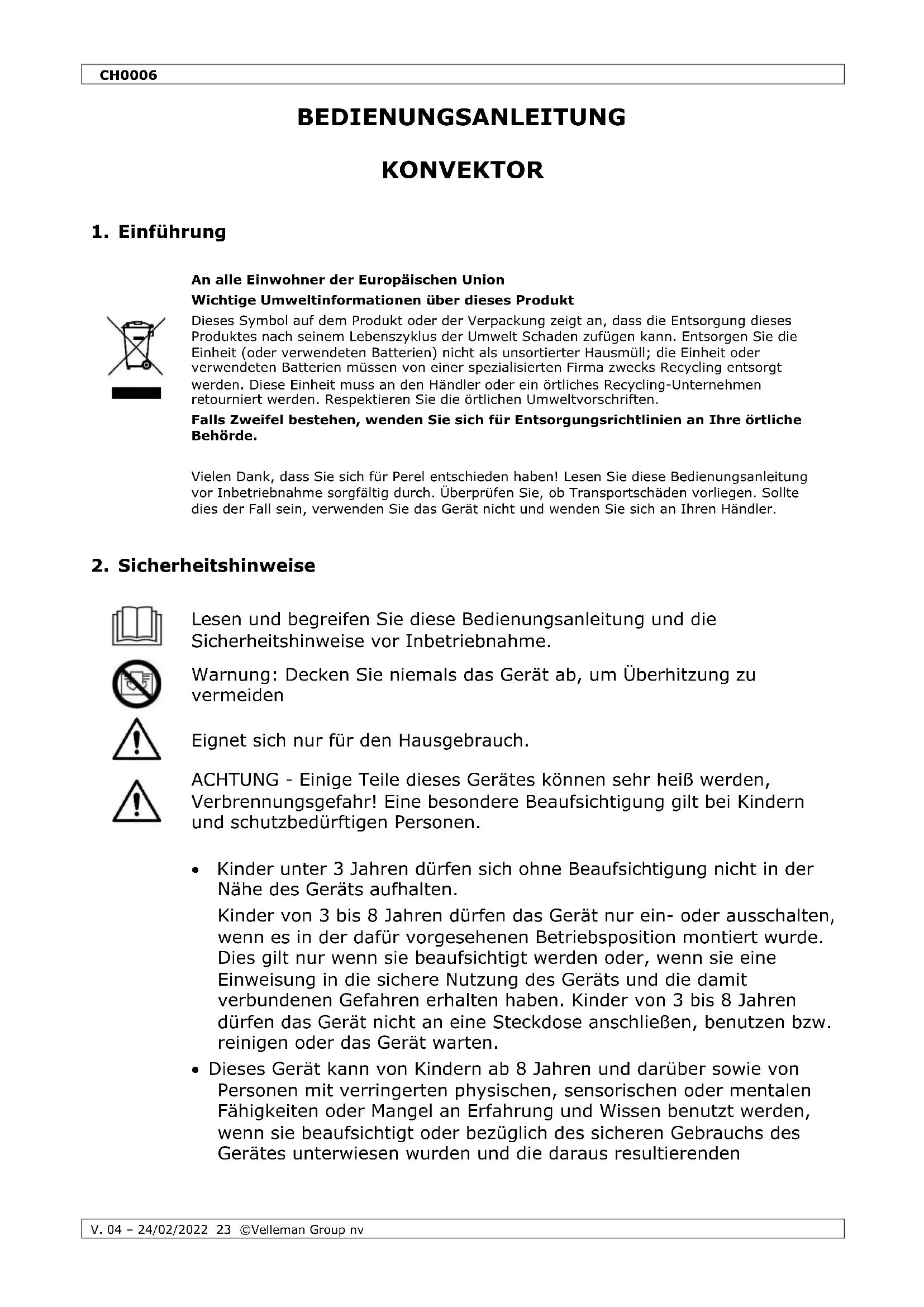 Laden Sie die Anleitung für Ihr Heizung kostenlos im PDF-Format! Finden Sie Ihr Handbuch CH0006 - Perel und nehmen Sie Ihr elektronisches Gerät wieder in die Hand. Auf dieser Seite sind alle Dokumente veröffentlicht, die für die Verwendung Ihres Geräts notwendig sind. CH0006 von der Marke Perel.