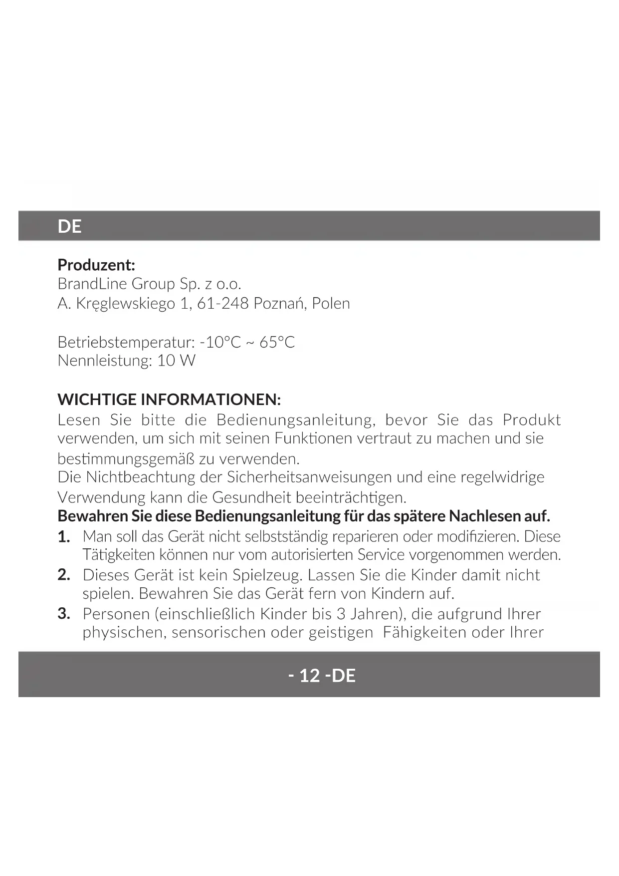 Zdjęcia mają charakter poglądowy, rzeczywisty wygląd produktów może różnić się od prezentowanego na zdjęciach.‑ 12 ‑DE Produzent: BrandLine Group Sp. z o.o. A. Kręglewskiego 1, 61-248 Poznań, Polen Betriebstemperatur: -10°C ~ 65°C Nennleistung: 10 W WICHTIGE INFORMATIONEN: Lesen Sie bitte die Bedienungsanleitung, bevor Sie das Produkt verwenden, um sich mit seinen Funkonen vertraut zu machen und sie besmmungsgemäß zu verwenden. Die Nichtbeachtung der Sicherheitsanweisungen und eine regelwidrige Verwendung kann die Gesundheit beeinträchgen. Bewahren Sie diese Bedienungsanleitung für das spätere Nachlesen auf.
