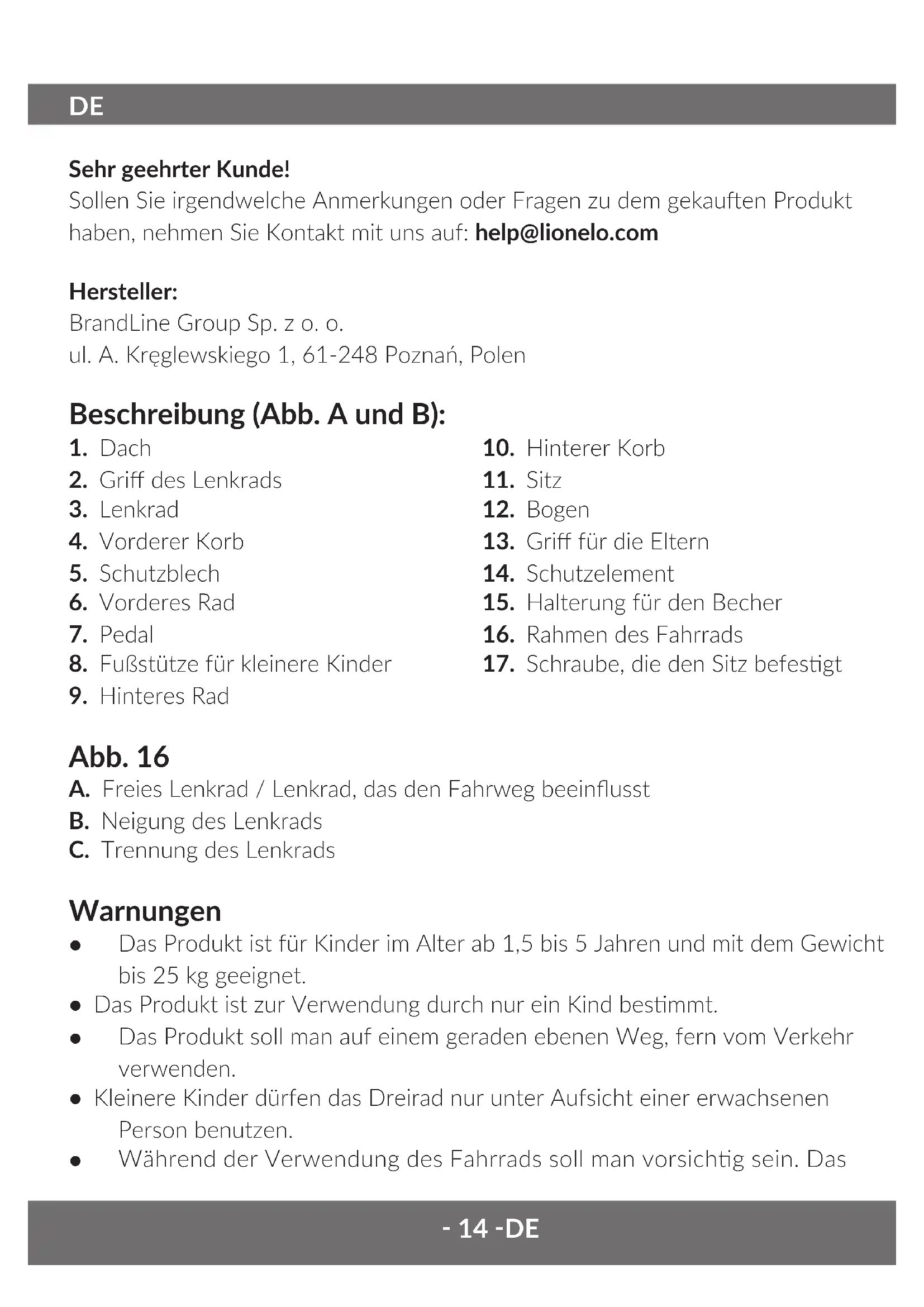 Sehr geehrter Kunde! Sollen Sie irgendwelche Anmerkungen oder Fragen zu dem gekauen Produkt haben, nehmen Sie Kontakt mit uns auf: help@lionelo.com Hersteller: BrandLine Group Sp. z o. o. ul. A. Kręglewskiego 1, 61-248 Poznań, Polen Beschreibung (Abb. A und B):