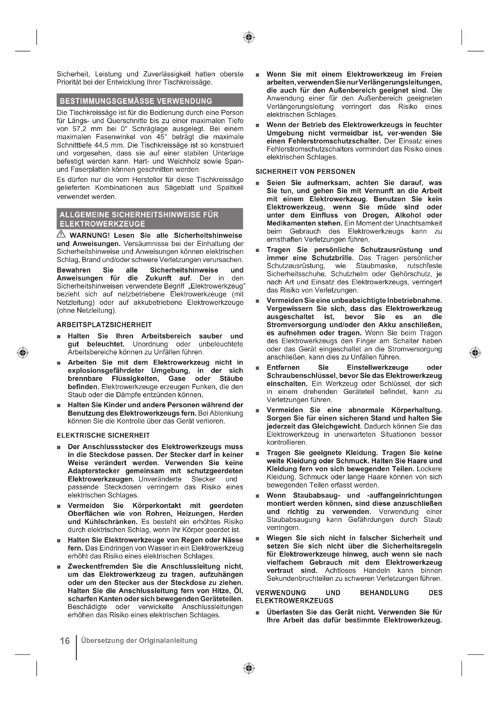 Die Tischkreissäge ist für die Bedienung durch eine Person für Längs- und Querschnitte bis zu einer maximalen Tiefe von 57,2 mm bei 0° Schräglage ausgelegt. Bei einem maximalen Fasenwinkel von 45° beträgt die maximale Schnitttiefe 44,5 mm. Die Tischkreissäge ist so konstruiert und vorgesehen, dass sie auf einer stabilen Unterlage befestigt werden kann. Hart- und Weichholz sowie Span- und Faserplatten können geschnitten werden. Es dürfen nur die vom Hersteller für diese Tischkreissäge gelieferten Kombinationen aus Sägeblatt und Spaltkeil verwendet werden.