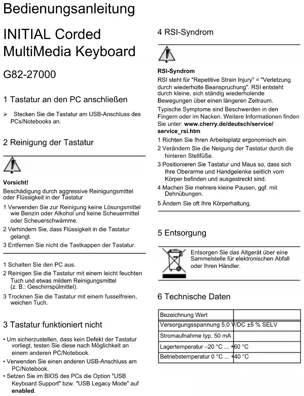 - Setzen Sie im BIOS des PCs die Option "USB Keyboard Support" bzw. "USB Legacy Mode" auf enabled. 4 RSI-Syndrom RSI-Syndrom RSI steht für "Repetitive Strain Injury" = "Verletzung durch wiederholte Beanspruchung". RSI entsteht durch kleine, sich ständig wiederholende Bewegungen über einen längeren Zeitraum. Typische Symptome sind Beschwerden in den Fingern oder im Nacken. Weitere Informationen finden Sie unter: www.cherry.de/deutsch/service/ service_rsi.htm 1 Richten Sie Ihren Arbeitsplatz ergonomisch ein. 2 Verändern Sie die Neigung der Tastatur durch die hinteren Stellfüße. 3 Positionieren Sie Tastatur und Maus so, dass sich Ihre Oberarme und Handgelenke seitlich vom Körper befinden und ausgestreckt sind. 4 Machen Sie mehrere kleine Pausen, ggf. mit Dehnübungen. 5 Ändern Sie oft Ihre Körperhaltung. 5 Entsorgung 6 Technische Daten Entsorgen Sie das Altgerät über eine Sammelstelle für elektronischen Abfall oder Ihren Händler. Bezeichnung Wert Versorgungsspannung 5,0 V/DC ±5 % SELV Stromaufnahme typ. 50 mA Lagertemperatur –20 °C ... +60 °C Betriebstemperatur 0 °C ... +40 °C Bedienungsanleitung4 7 Kontakt ZF Electronics GmbH Cherrystraße 91275 Auerbach www.cherrycorp.com www.cherry.de E-Mail: info@cherry.de Telefon: Vertrieb: +49 (0) 180 5 243779* (0180 5 CHERRY*) Technischer Support: +49 (0) 180 5 919108* (*14 Cent/Min. aus dem deutschen Festnetz, abweichende Preise für Anrufe aus Mobilfunknetzen möglich.) Bitte halten Sie bei Anfragen an den Technischen Support folgende Informationen bereit: