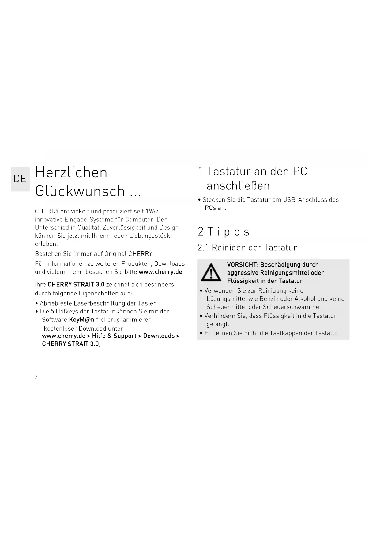 - Die 5 Hotkeys der Tastatur können Sie mit der Software KeyM@n frei programmieren (kostenloser Download unter: www.cherry.de > Hilfe & Support > Downloads > CHERRY STRAIT 3.0) 1 Tastatur an den PC anschließen