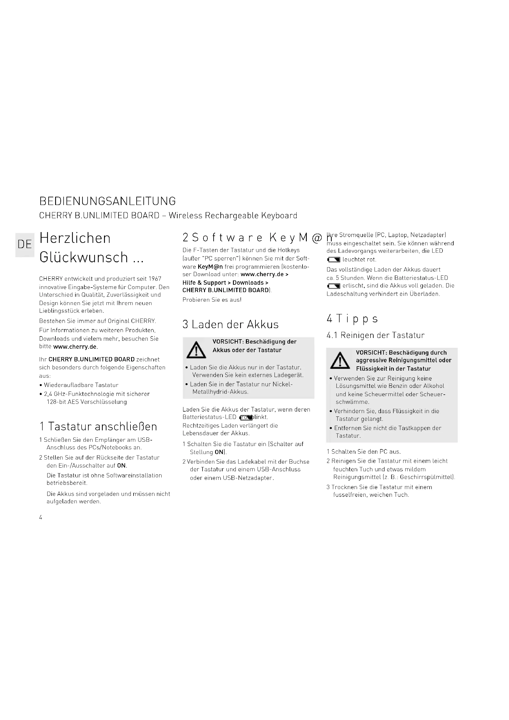 - Entfernen Sie nicht die Tastkappen der Tastatur. BEDIENUNGSANLEITUNG CHERRY B.UNLIMITED BOARD – Wireless Rechargeable Keyboard DE5