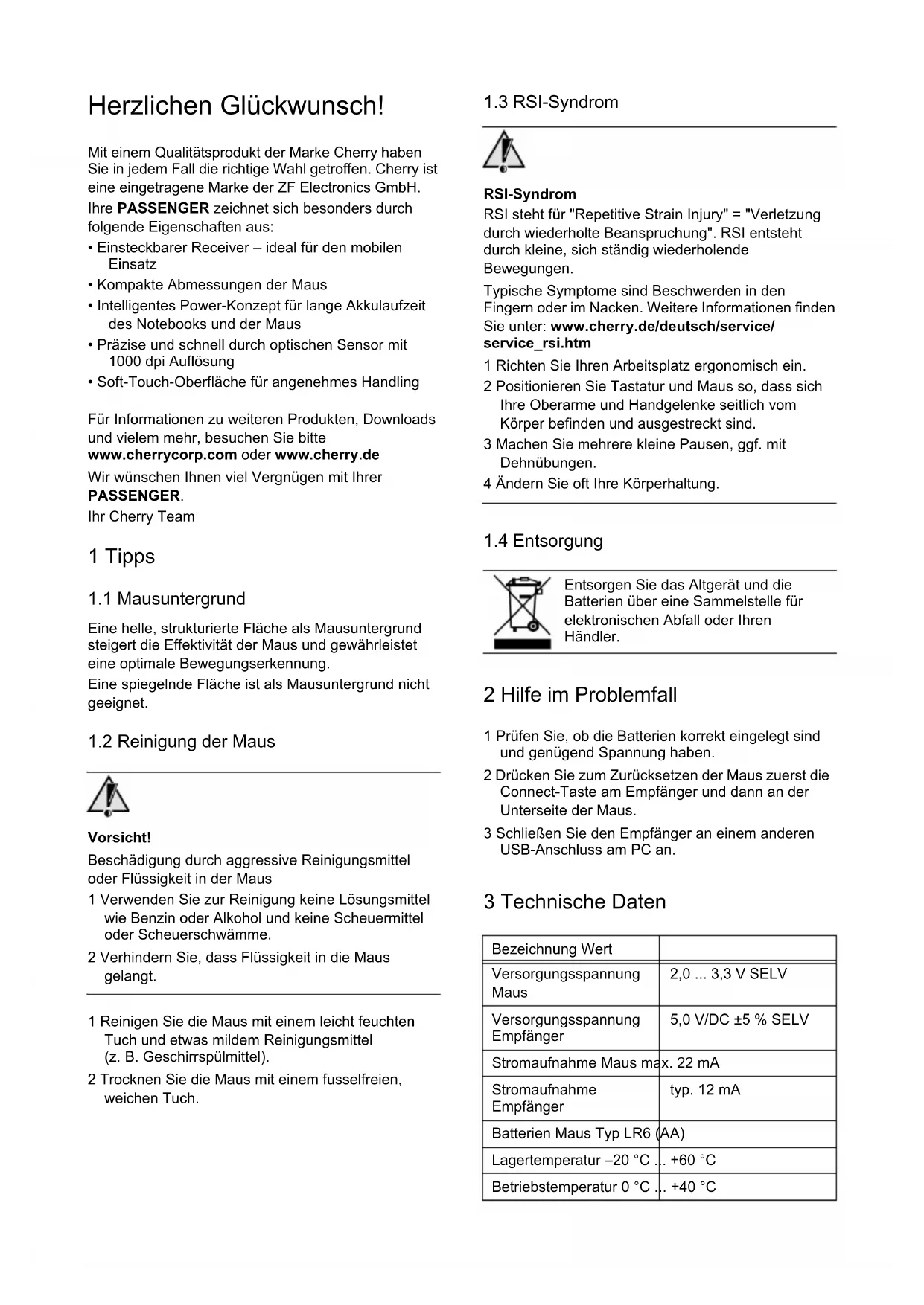 Stromaufnahme Maus max. 22 mA Stromaufnahme Empfänger typ. 12 mA Batterien Maus Typ LR6 (AA) Lagertemperatur –20 °C ... +60 °C Betriebstemperatur 0 °C ... +40 °C4 Kontakt ZF Electronics GmbH Cherrystraße 91275 Auerbach www.cherrycorp.com www.cherry.de E-Mail: info@cherry.de Telefon: Vertrieb: +49 (0) 180 5 243779* (0180 5 CHERRY*) Technischer Support: +49 (0) 180 5 919108* (*14 Cent/Min. aus dem deutschen Festnetz, abweichende Preise für Anrufe aus Mobilfunknetzen möglich.) Bitte halten Sie bei Anfragen an den Technischen Support folgende Informationen bereit: