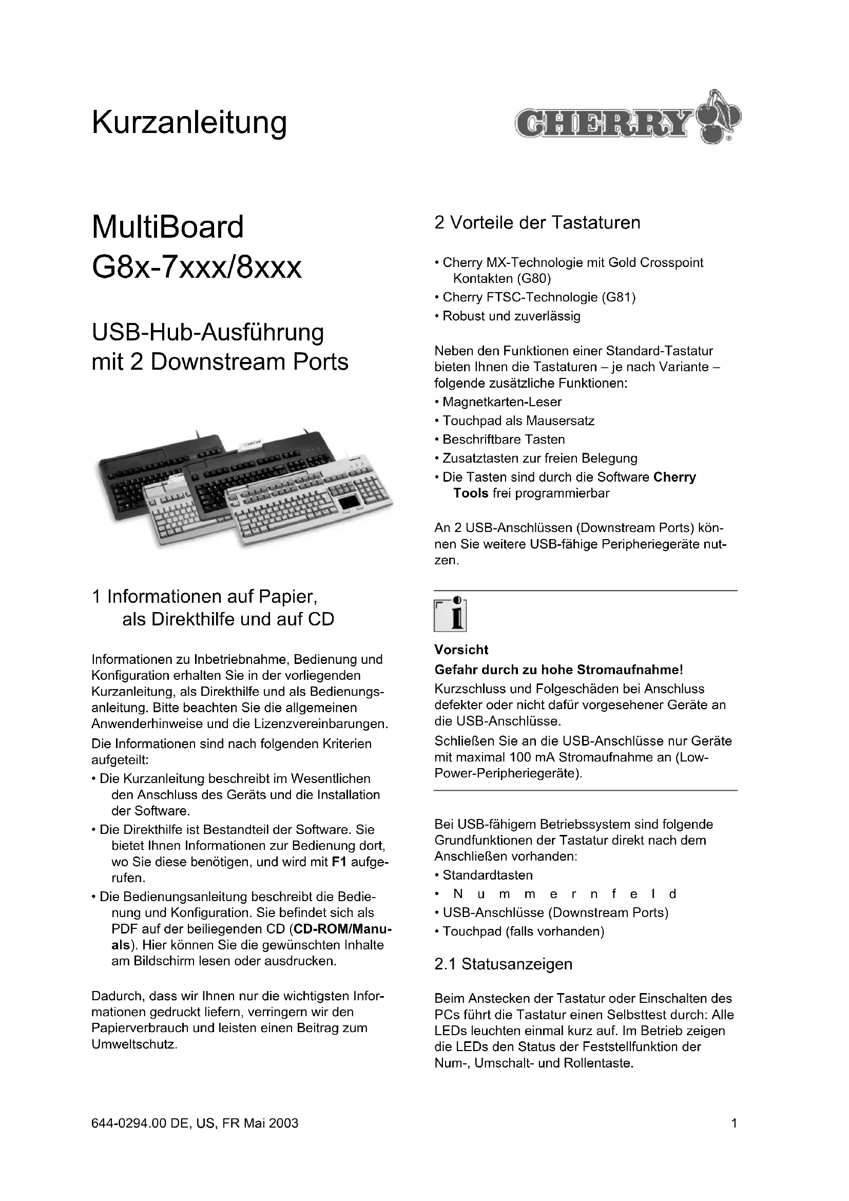 Beim Anstecken der Tastatur oder Einschalten des PCs führt die Tastatur einen Selbsttest durch: Alle LEDs leuchten einmal kurz auf. Im Betrieb zeigen die LEDs den Status der Feststellfunktion der Num-, Umschalt- und Rollentaste. Kurzanleitung 644-0294.00 DE, US, FR Mai 20032 3 Technische Daten aller Varianten 4 Technische Daten MultiBoard G81-7000 Bezeichnung Wert Schnittstellen USB-Stecker, 2 USB- Downstream Ports nach USB 2.0 (full speed, 12 Mbit/s) Lesegeschwindigkeit Magnetkarten-Leser 3 bis 125 ips bei 75 bpi, 3 bis 50 ips bei 210 bpi (ips = Inches pro Sekunde, bpi = Bits pro Inch) Lesezyklen Magnetkarten-Leser bis zu 1.000.000 Spannungsversorgung +5 V/DC ±5 % SELV Stromaufnahme max. 400 mA Stromabgabe max. 100 mA pro Downstream Port Lagertemperatur −20 °C bis +60 °C Betriebstemperatur 0 °C bis +50 °C Kabellänge ca. 1,75 m Bezeichnung Wert Tastaturtyp 104/105 Tasten, Magnetkarten-Leser, 19-Zoll-Kompaktfor- mat, FTSC-Technolo- gie Gewicht (incl. Verpackung) ca. 2050 g Abmessungen (L x B x H) 405 x 220 x 64 mm 5 Technische Daten MultiBoard G81-8000 6 Technische Daten MultiBoard G80-8113 Bezeichnung Wert Tastaturtyp 104/105 Tasten, Magnetkarten-Leser, FTSC-Technologie Gewicht (incl. Verpackung) ca. 2250 g Abmessungen (L x B x H) 470 x 220 x 64 mm Bezeichnung Wert Tastaturtyp 120/121 Tasten, davon 41 beschriftbar, Magnetkarten-Leser, Touchpad, MX-Tech- nologie mit Gold Crosspoint Kontakten Auflösung Touchpad 1000 dpi Gewicht (incl. Verpackung) ca. 2000 g Abmessungen (L x B x H) 470 x 220 x 64 mm3 7 Technische Daten MultiBoard G80-8200 8 Belegung USB-Stecker und -Anschluss USB-Stecker und -Anschluss (Downstream Port) der Tastatur Bezeichnung Wert Tastaturtyp 120/121 Tasten, davon 48 beschriftbar, Magnetkarten-Leser, MX-Technologie mit Gold Crosspoint Kon- takten Gewicht (incl. Verpackung) ca. 2250 g Abmessungen (L x B x H) 470 x 220 x 64 mm Position Belegung 1+5 V 2 −DATA 3+DATA 4GND 9 Anschluss des Geräts Gerät über USB-Anschluss anschließen 1 Ermitteln Sie einen USB-Anschluss an der Rückseite Ihres PCs oder an einer Cherry-Tas- tatur mit USB-Hub. 2 Stecken Sie den USB-Stecker des Geräts in einen beliebigen USB-Anschluss. 10 Installation der Software Die Installation erfolgt in zwei Schritten:
