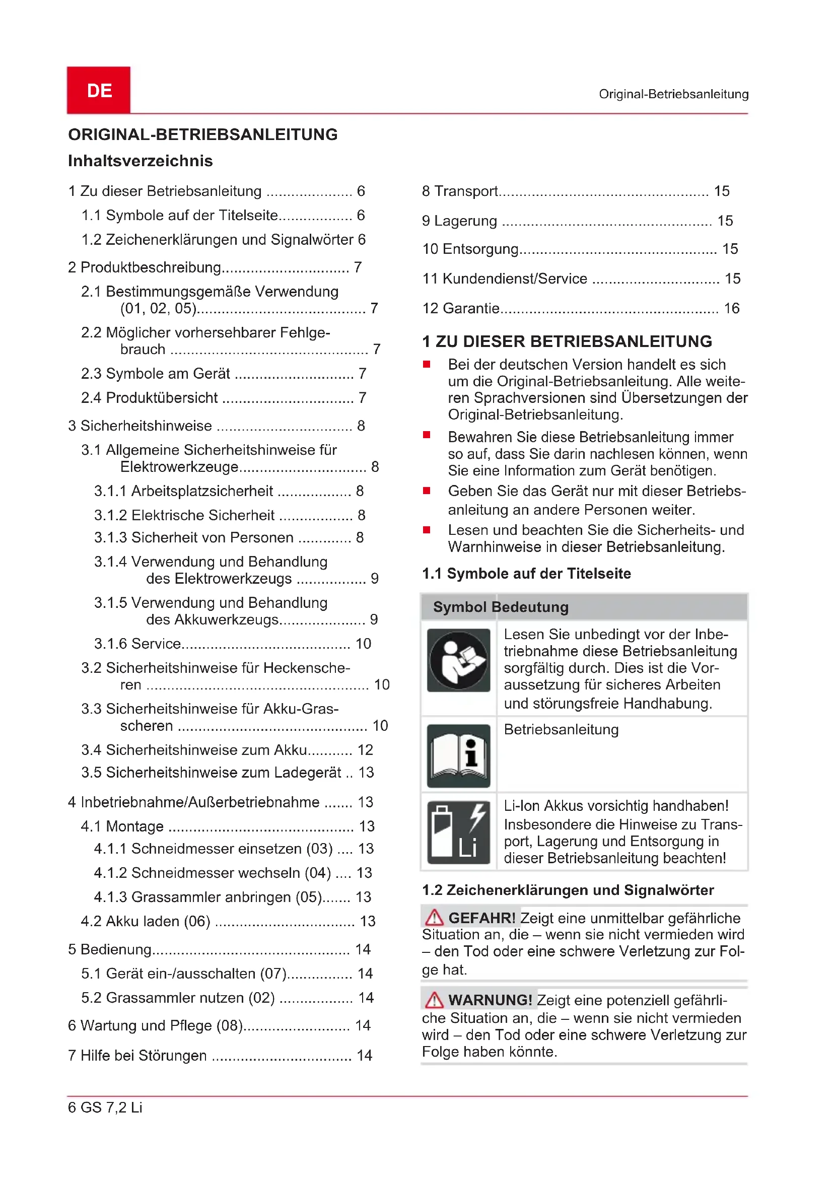]DE 6 GS 7,2 Li Original-Betriebsanleitung ORIGINAL-BETRIEBSANLEITUNG Inhaltsverzeichnis 1 Zu dieser Betriebsanleitung ..................... 6