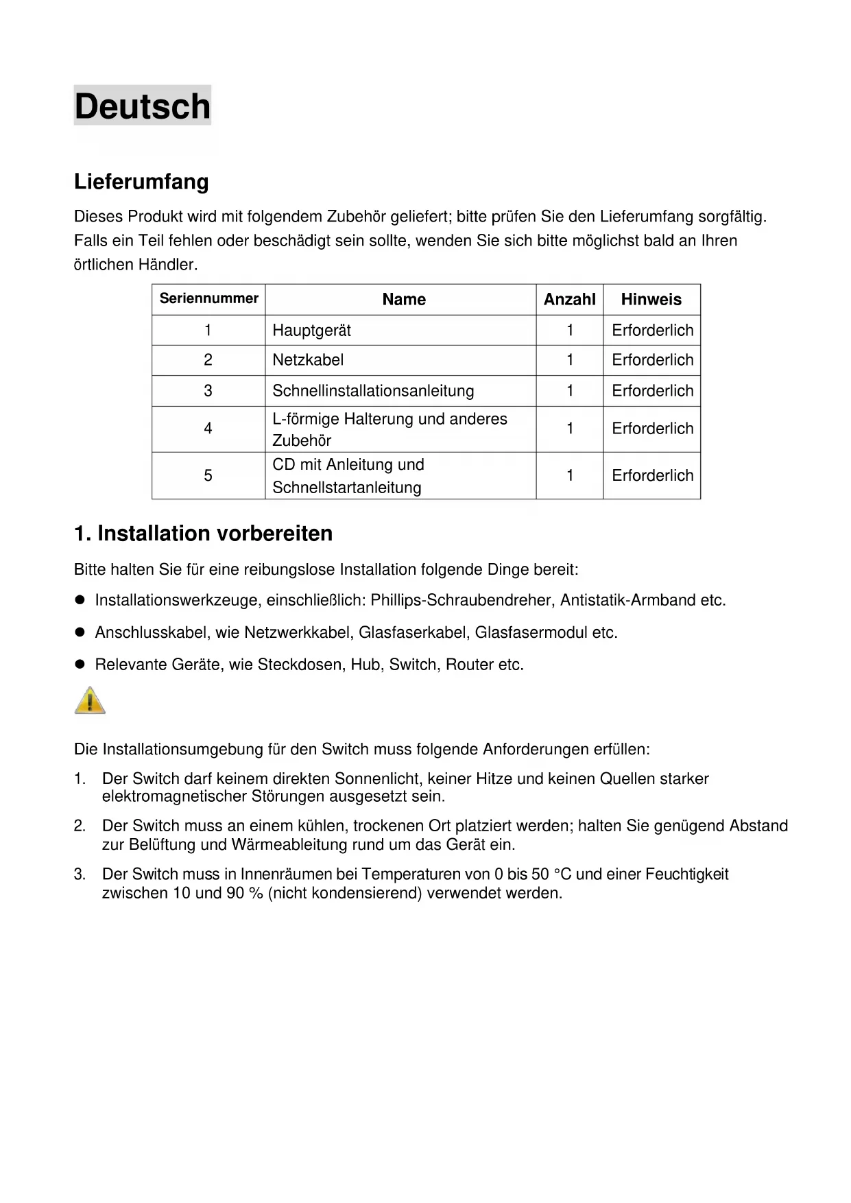 Bitte halten Sie für eine reibungslose Installation folgende Dinge bereit: Installationswerkzeuge, einschließlich: Phillips-Schraubendreher, Antistatik-Armband etc. Anschlusskabel, wie Netzwerkkabel, Glasfaserkabel, Glasfasermodul etc. Relevante Geräte, wie Steckdosen, Hub, Switch, Router etc. Die Installationsumgebung für den Switch muss folgende Anforderungen erfüllen: 1. Der Switch darf keinem direkten Sonnenlicht, keiner Hitze und keinen Quellen starker elektromagnetischer Störungen ausgesetzt sein. 2. Der Switch muss an einem kühlen, trockenen Ort platziert werden; halten Sie genügend Abstand zur Belüftung und Wärmeableitung rund um das Gerät ein. 3. Der Switch muss in Innenräumen bei Temperaturen von 0 bis 50 °C und einer Feuchtigkeit zwischen 10 und 90 % (nicht kondensierend) verwendet werden.2. Geräteinstallation ■ In einem Rack Installieren Sie den Switch in einem 19-inch -Zoll-Standardrack, befolgen Sie die nachstehenden Installationsschritte: