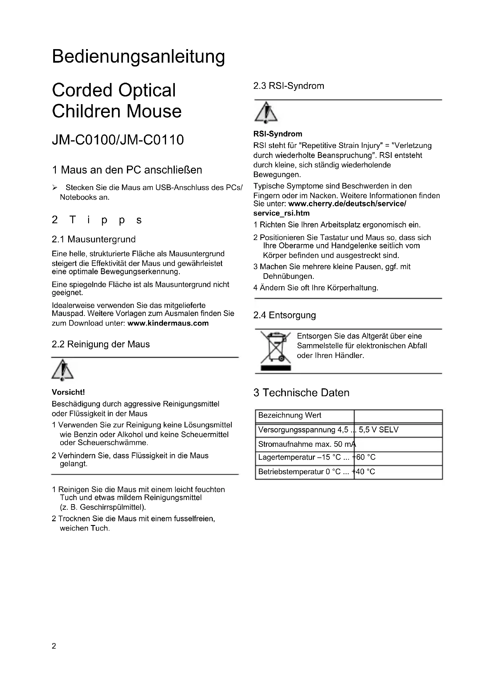 - Betriebssystem und ggf. installierte Version eines Service Packs 5 Allgemeiner Anwenderhinweis Cherry, eine Marke der ZF Electronics GmbH, optimiert seine Produkte ständig im Zuge der Entwicklung von neuen Technologien. Technische Änderungen behalten wir uns deshalb vor. Die Ermittlung der Zuverlässigkeit sowie die Definition von technischen Angaben erfolgen gemäß interner Prüfung, um international anerkannte Vorschriften bzw. Normen zu erfüllen. Davon abweichende Anforderungen können durch gegenseitige Zusammenarbeit erfüllt werden. Unsachgemäße Behandlung, Lagerung und äußere Einflüsse können zu Störungen und Schäden im Einsatz führen. Wir übernehmen keinerlei Gewährleistung für Mängel, die auf einer anwenderseitigen Veränderung des Produkts beruhen, und haften nicht im Falle unbefugter Veränderungen. Alle Reparaturen müssen durch uns oder eine offiziell berechtigte Person oder Organisation durchgeführt werden. Etwaige Schadensersatzansprüche gegen die ZF Electronics GmbH oder ihre eingesetzten Vertreter – gleich aus welchem Rechtsgrund (einschließlich stressbedingte körperliche Schäden) – sind ausgeschlossen, soweit uns nicht Vorsatz, grobe Fahrlässigkeit oder die Nichtbeachtung zwingender Produkthaftungsbestimmungen treffen oder bei Verletzungen von Leben, Körper oder Gesundheit. Die vorliegende Anleitung ist nur gültig für das mitgelieferte Produkt. Weitere Informationen darüber sind bei den jeweiligen Distributoren oder direkt über uns erhältlich. 6 Sicherheitshinweise Erstickungsgefahr durch Verschlucken von Kleinteilen ¾ Bewahren Sie das Gerät außerhalb der Reichweite von Kindern unter 6 Jahren auf. 1 Verhindern Sie, dass das Gerät heruntergeworfen, zerdrückt, zertreten oder anderweitig zerstört wird. 2 Prüfen Sie das Gerät regelmäßig auf Schäden und ersetzen Sie es bei Beschädigung. 3 Halten Sie Ihr Kind dazu an, Sie zu informieren, wenn es Beschädigungen am Gerät entdeckt. 4 Halten Sie Ihr Kind zum vorsichtigen Umgang mit dem Kabel an und richten Sie den PC-Arbeitsplatz so ein, dass niemand über das Kabel stolpert. 7 CE-Konformitätserklärung Wir, ZF Electronics GmbH, erklären, dass das Produkt JM-C0100/JM-C0110 (JM-C01) mit folgender Anforderung übereinstimmt: