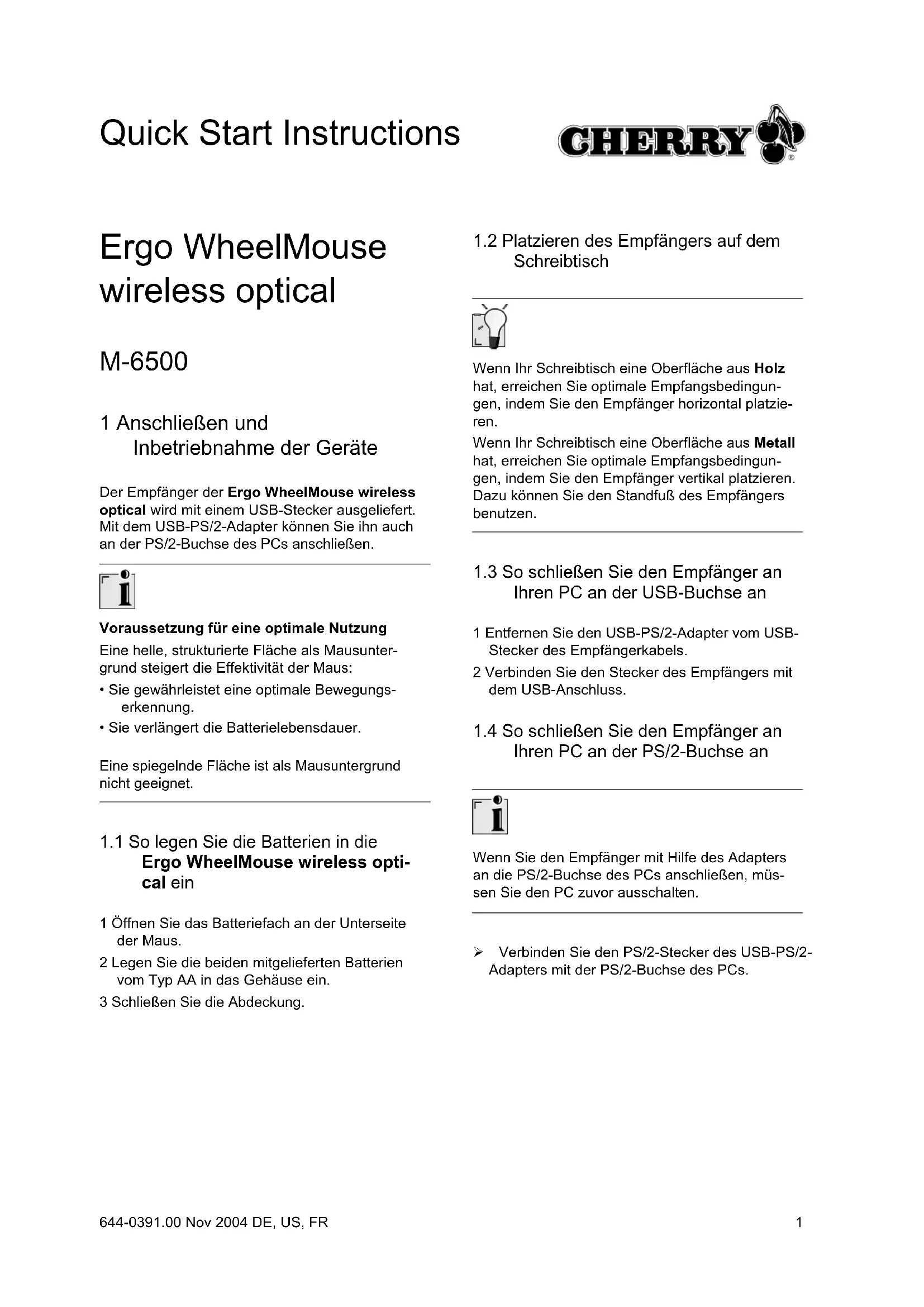Windows 95/98/ME/2000/XP 1 Legen Sie die mitgelieferte CD-ROM in Ihr CD-ROM-Laufwerk. Die CD-ROM wird automatisch gestartet. Das Fenster Ergo WheelMouse wireless optical wird geöffnet. - oder - Wenn die CD-ROM nicht automatisch gestartet wird, wählen Sie im Windows Explorer CD-ROM-Laufwerk | Software und doppelklicken Sie mit der linken Maus-Taste auf die Datei Setup.exe. Die Installation beginnt. 2 Bei automatischem Start der CD-ROM klicken Sie auf den Eintrag Softwareinstallation star- ten. Abhängig von den Einstellungen Ihres Internet- Browsers haben Sie die Möglichkeit, die Datei zu speichern oder zu öffnen. 3 Wählen Sie nach Möglichkeit die Option Öffnen und klicken Sie auf die Schaltfläche OK. - oder - Besteht nur die Option, die Datei zu speichern, dann brechen Sie den Dialog ab, wählen im Windows Explorer CD-ROM-Laufwerk | Software und doppelklicken mit der linken Maus-Taste auf die Datei Setup.exe. Die Installation beginnt. 4 Folgen Sie den Installationsanweisungen auf dem Bildschirm. 4 Support Bei Problemen mit der Installation von Tastatur oder Software bieten wir Ihnen einen kostenlosen Support. Unter http://support.cherry.de erreichen Sie den Cherry-Support. Dort können Sie Ihre Anfragen rund um die Uhr, sieben Tage in der Woche, direkt an uns übermitteln. Sollten Sie nicht über einen Internet-Zugang verfü- gen, kontaktieren Sie uns bitte unter folgender Adresse: Cherry GmbH Cherrystraße 91275 Auerbach Hotline: Tel.: +49(0)1805-919108 (12 ct/min) Fax: +49(0)9643-18-1545 Wir stehen Ihnen Mo bis Do von 7:15 bis 16:00 Uhr und Fr von 7:15 bis 13:30 Uhr (GMT + 1h) zur Ver- fügung.3 5 Allgemeiner Anwenderhinweis Cherry optimiert seine Produkte ständig im Zuge der Entwicklung von neuen Technologien. Techni-sche Änderungen behalten wir uns deshalb vor. Die Ermittlung der Zuverlässigkeit sowie die Defini-tion von technischen Angaben erfolgen gemäß Cherry-interner Prüfung, um international aner-kannte Vorschriften bzw. Normen zu erfüllen. Davon abweichende Anforderungen können durch gegenseitige Zusammenarbeit erfüllt werden. Unsachgemäße Behandlung, Lagerung und äußere Einflüsse können zu Störungen und Schä-den im Einsatz führen.Wir übernehmen keinerlei Gewährleistung für Män-gel, die auf einer anwenderseitigen Veränderung des Produkts beruhen, und haften nicht im Falle unbefugter Veränderungen. Alle Reparaturen müs-sen durch Cherry oder eine offiziell berechtigte Person oder Organisation durchgeführt werden. Bei unsachgemäßem Austausch der optional ein-gesetzten Lithiumbatterie besteht Explosionsge-fahr! Etwaige Schadensersatzansprüche gegen Cherry oder seine eingesetzten Vertreter – gleich aus welchem Rechtsgrund (einschließlich stress-bedingte körperliche Schäden) – sind ausgeschlos-sen, soweit uns nicht Vorsatz, grobe Fahrlässigkeit oder die Nichtbeachtung zwingender Produkthaf-tungsbestimmungen treffen oder bei Verletzungen von Leben, Körper oder Gesundheit. Die vorlie-gende Anleitung ist nur gültig für das mitgelieferte Produkt.Weitere Informationen darüber sind bei den jeweili-gen Cherry-Distributoren oder direkt über die Cherry GmbH erhältlich. 6 CE Konformitätserklärung Wir, Cherry GmbH, erklären, dass das Produkt Ergo WheelMouse wireless optical (M-6500) mit folgenden Anforderungen übereinstimmt:• Niederspannungsrichtlinie 73/23/EWG, geprüft nach EN 60950• EMC-Richtlinie (Richtlinie zur elektromagneti-schen Verträglichkeit) 89/336/EWG, geprüft nach EN 55024, EN 55022 und EN 301 489-1, -3• Gesetz über Funkanlagen und Telekommunika-tionsendeinrichtungen (FTEG) und R&TTE-Richtlinie geprüft nach EN 300 220-3Getestet gemäß Cherry Standard-Testverfahren. Ergo WheelMouse wireless optical M-6500 1 Connecting and starting-up the devices The receiver of the Ergo WheelMouse wireless optical is supplied with a USB connector. You can also connect it to the PS/2 port of the PC by means of the USB-PS/2 adapter. Prerequisite for optimal use A bright, structured surface under the mouse increases the efficiency of the mouse:• It ensures optimum detection of movement.• It increases the battery life.A reflective surface is not suitable for use under the mouse.