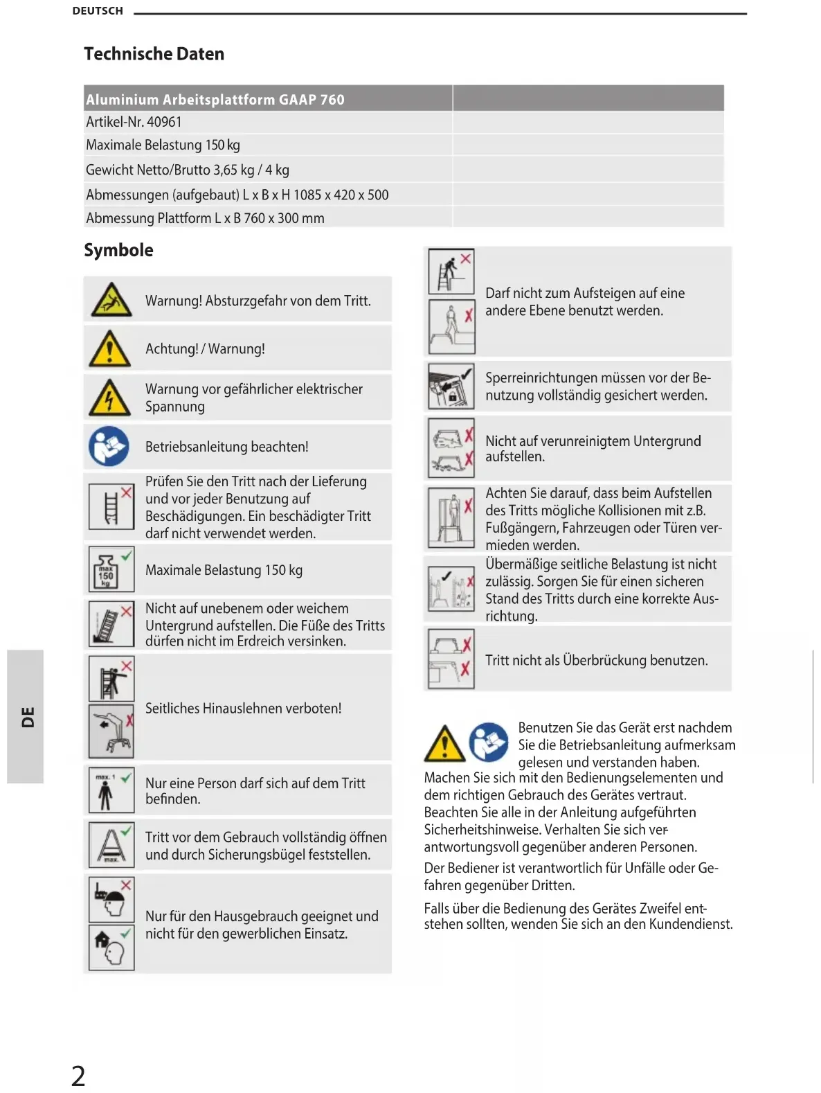 stehen sollten, wenden Sie sich an den Kundendienst. Technische Daten Aluminium Arbeitsplattform GAAP 760 Artikel-Nr. 40961 Maximale Belastung 150 kg Gewicht Netto/Brutto 3,65 kg / 4 kg Abmessungen (aufgebaut) L x B x H 1085 x 420 x 500 Abmessung Plattform L x B 760 x 300 mm