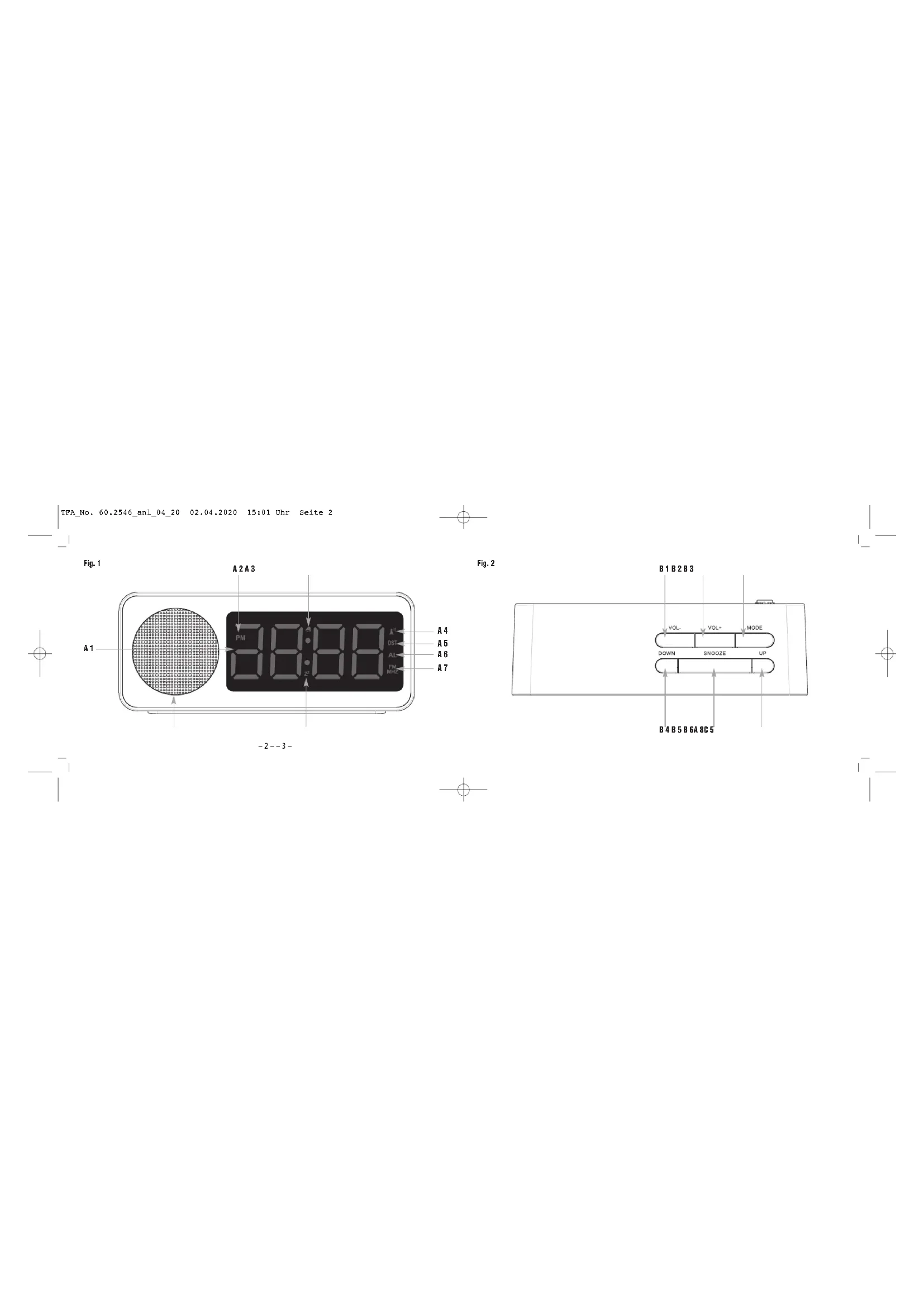 - Beachten Sie besonders die Sicherheitshinweise!• Bewahren Sie diese Anleitung gut auf!2. Lieferumfang• Funkwecker mit Radio • Netzteil • Bedienungsanleitung3. Einsatzbereich und alle Vorteile Ihres neuen Gerätes auf einen Blick• Funkuhr mit höchster Genauigkeit • FM Radio • Weckalarm mit Snooze-Funktion• Snooze-Dauer individuell einstellbar Fig. 3 C 4 C 2 C 3 C 1 TFA_No. 60.2546_anl_04_20 02.04.2020 15:01 Uhr Seite 3– 6 – – 7 –
