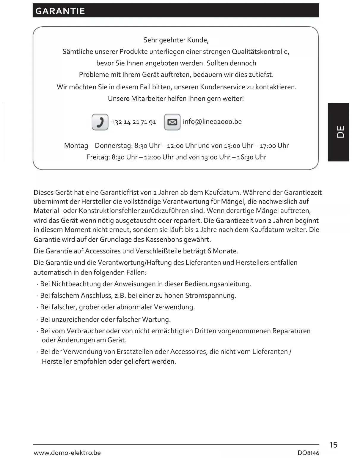 - Benutzen Sie dieses Gerät nur für den vorgesehenen Verwendungszweck.17 DO8146 www.domo-elektro.be
