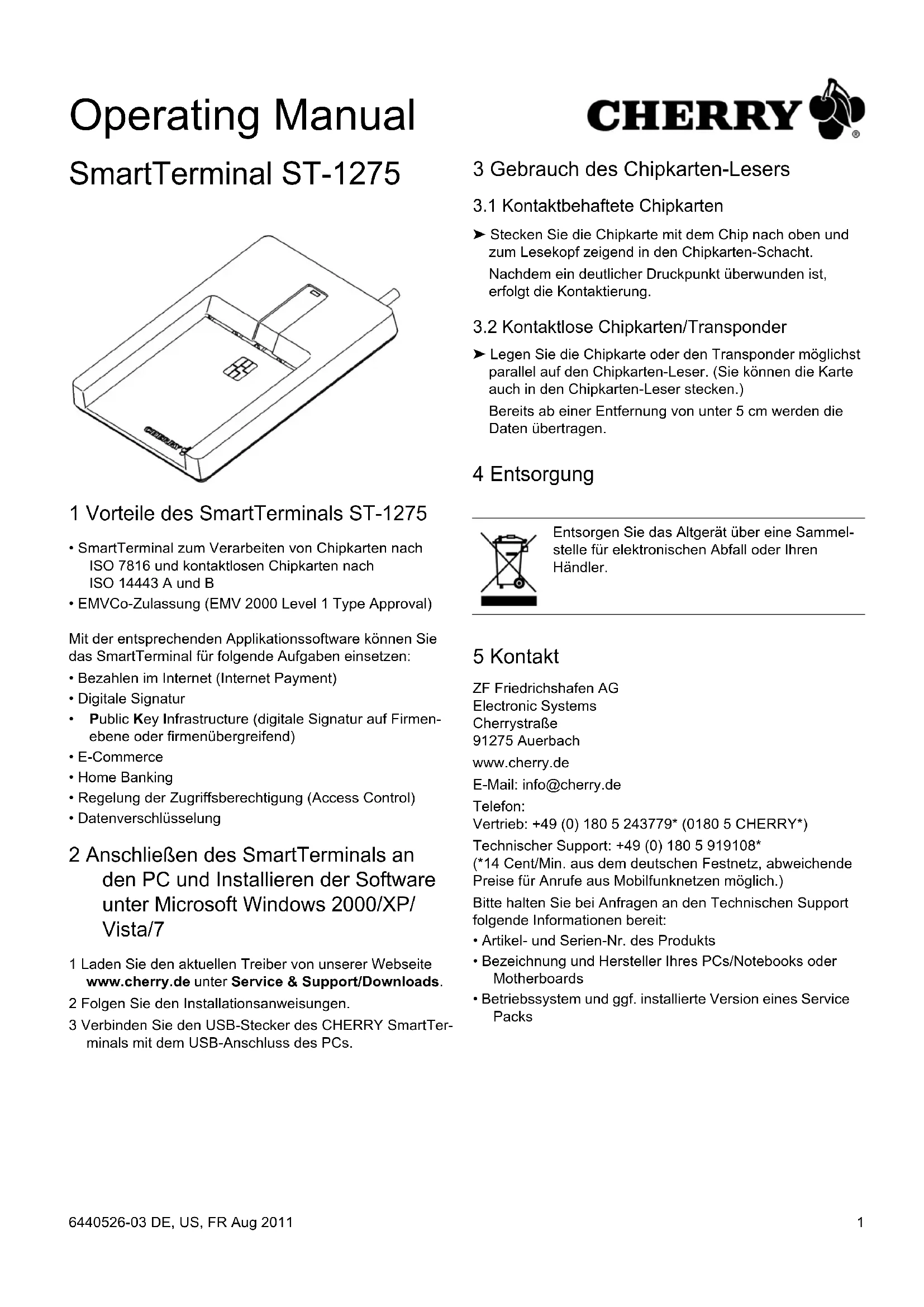 - Betriebssystem und ggf. installierte Version eines Service Packs Entsorgen Sie das Altgerät über eine Sammel- stelle für elektronischen Abfall oder Ihren Händler. Operating Manual 6440526-03 DE, US, FR Aug 20112 6 Allgemeiner Anwenderhinweis CHERRY, eine Marke der ZF Friedrichshafen AG, optimiert seine Produkte ständig im Zuge der Entwicklung von neuen Technologien. Technische Änderungen behalten wir uns deshalb vor. Die Ermittlung der Zuverlässigkeit sowie die Definition von technischen Angaben erfolgen gemäß interner Prüfung, um international anerkannte Vorschriften bzw. Normen zu erfüllen. Davon abweichende Anforderungen können durch gegenseitige Zusammenarbeit erfüllt werden. Unsachgemäße Behandlung, Lagerung und äußere Einflüsse können zu Störungen und Schäden im Einsatz führen. Wir übernehmen keinerlei Gewährleistung für Mängel, die auf einer anwenderseitigen Veränderung des Produkts beruhen, und haften nicht im Falle unbefugter Veränderungen. Alle Reparaturen müssen durch uns oder eine offiziell berechtigte Person oder Organisation durchgeführt werden. Etwaige Schadensersatzansprüche gegen die ZF Friedrichshafen AG oder ihre eingesetzten Vertreter – gleich aus welchem Rechtsgrund (einschließlich stressbedingte körperliche Schäden) – sind ausgeschlossen, soweit uns nicht Vorsatz, grobe Fahrlässigkeit oder die Nichtbeachtung zwingender Produkthaftungsbestimmungen treffen oder bei Verletzungen von Leben, Körper oder Gesundheit. Die vorliegende Anleitung ist nur gültig für das mitgelieferte Produkt. Weitere Informationen darüber sind bei den jeweiligen Distributoren oder direkt über uns erhältlich. SmartTerminal ST-1275 1 Advantages of the SmartTerminal ST-1275