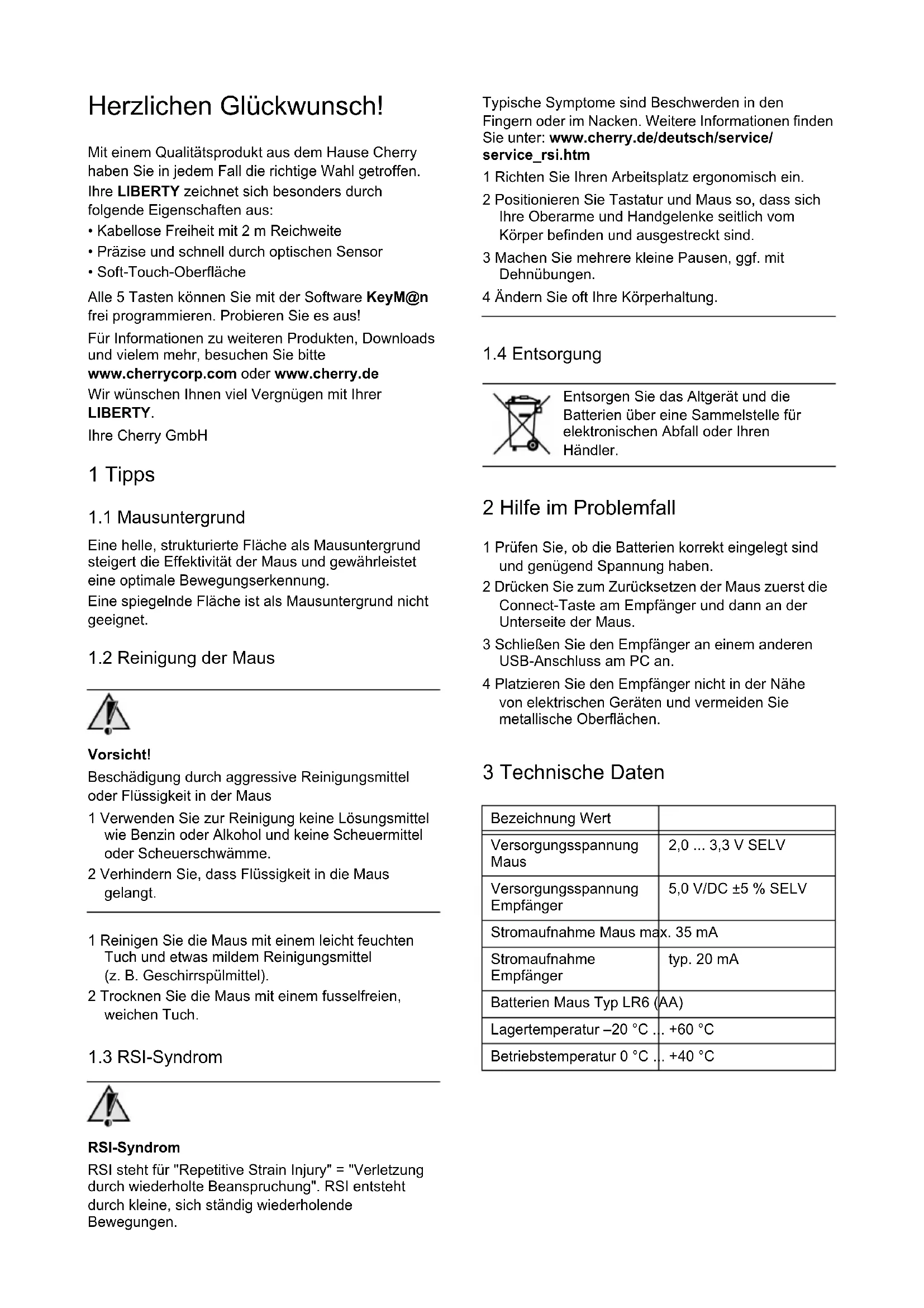 - Betriebssystem und ggf. installierte Version eines Service Packs 5 Allgemeiner Anwenderhinweis Cherry optimiert seine Produkte ständig im Zuge der Entwicklung von neuen Technologien. Technische Änderungen behalten wir uns deshalb vor. Die Ermitt- lung der Zuverlässigkeit sowie die Definition von tech- nischen Angaben erfolgen gemäß Cherry-interner Prüfung, um international anerkannte Vorschriften bzw. Normen zu erfüllen. Davon abweichende Anfor- derungen können durch gegenseitige Zusammenar- beit erfüllt werden. Unsachgemäße Behandlung, Lagerung und äußere Einflüsse können zu Störungen und Schäden im Einsatz führen. Wir übernehmen keinerlei Gewährleistung für Män- gel, die auf einer anwenderseitigen Veränderung des Produkts beruhen, und haften nicht im Falle unbefug- ter Veränderungen. Alle Reparaturen müssen durch Cherry oder eine offiziell berechtigte Person oder Organisation durchgeführt werden. Etwaige Schadensersatzansprüche gegen Cherry oder seine eingesetzten Vertreter – gleich aus wel- chem Rechtsgrund (einschließlich stressbedingte kör- perliche Schäden) – sind ausgeschlossen, soweit uns nicht Vorsatz, grobe Fahrlässigkeit oder die Nichtbe- achtung zwingender Produkthaftungsbestimmungen treffen oder bei Verletzungen von Leben, Körper oder Gesundheit. Die vorliegende Anleitung ist nur gültig für das mitgelieferte Produkt. Weitere Informationen darüber sind bei den jeweili- gen Cherry-Distributoren oder direkt über die Cherry GmbH erhältlich. Congratulations! When you select a quality product from Cherry, you've always made the right choice. The following features in particular set your LIBERTY apart: